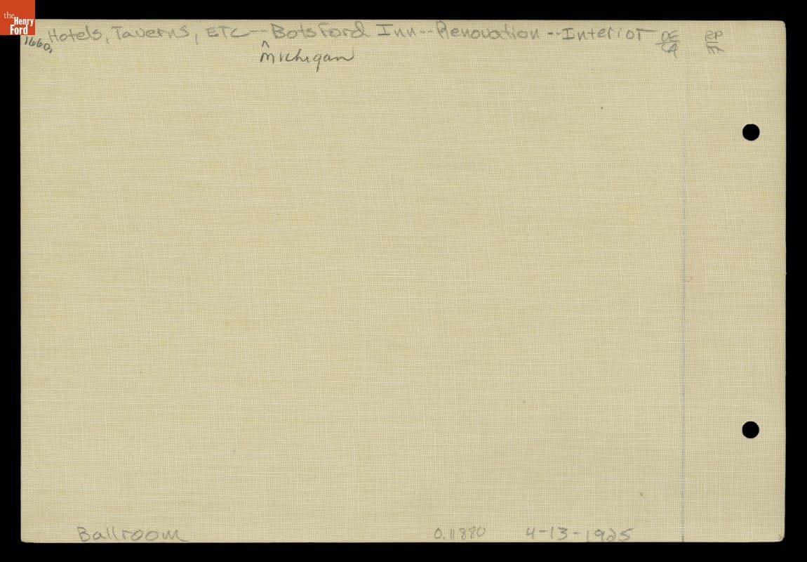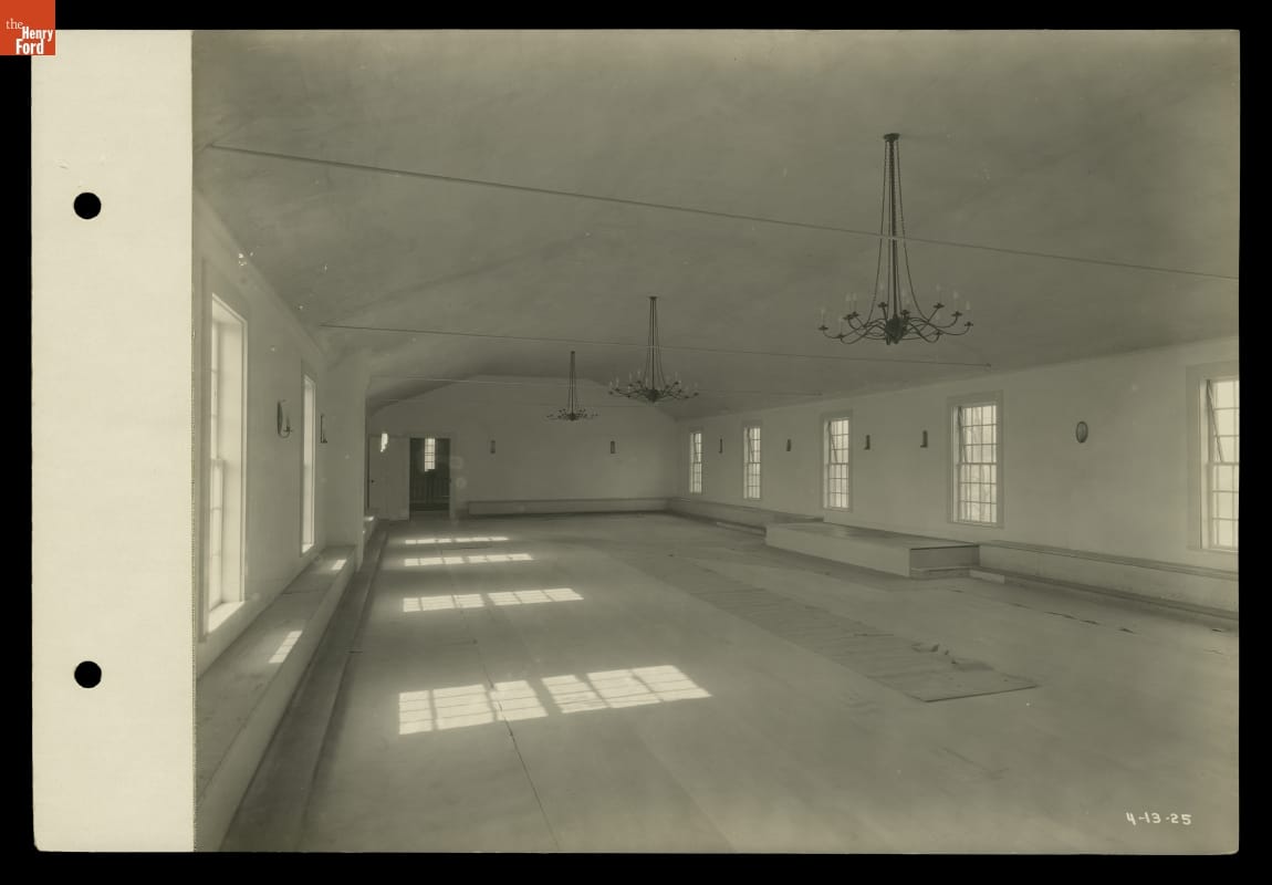 As a youth during the 1880s, Henry Ford had attended dances at the Botsford Inn, an 1836 tavern on the route from Detroit to Lansing, Michigan. After buying and restoring the building in 1924, Ford held some of his early "old-fashioned" dance parties in the inn's ballroom. This image shows the restored ballroom and the maple dance floor Ford installed there.