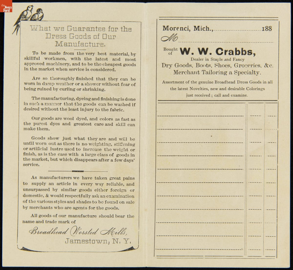 Manufactured by Broadhead Worsted Mills, Jamestown, New York. Retailed by W.W. Crabbs, Morenci, Michigan. Lithographed by Gies & Co., Buffalo, New York.