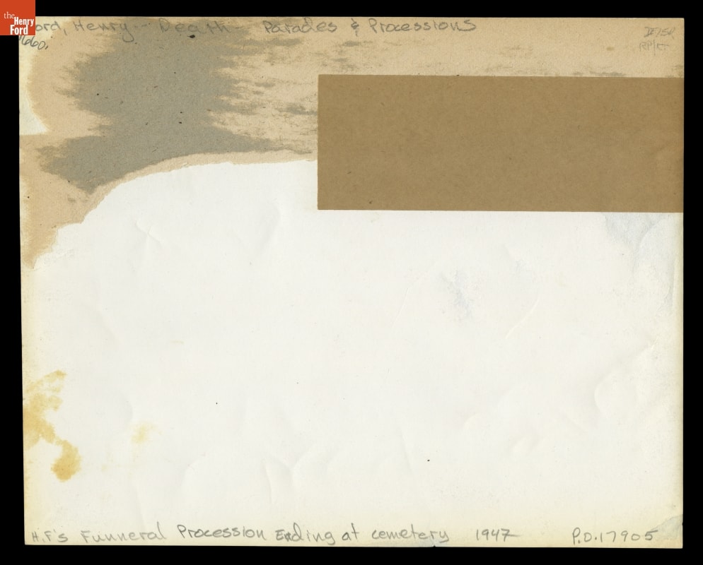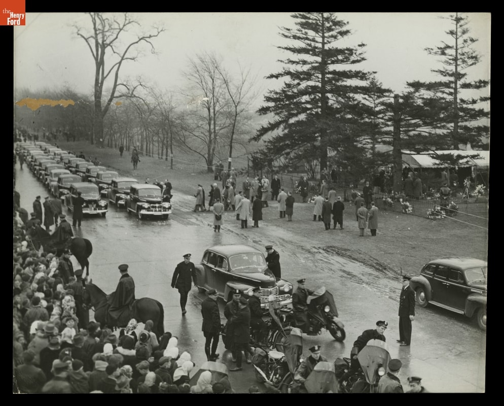 Henry Ford died on April 7, 1947, at his Fair Lane estate in Dearborn, Michigan. Thousands mourned his death. Many waited in a mile-long line to pay their respects when Ford lay in repose at Greenfield Village. This photograph shows the funeral procession and crowds lining the street at Ford Cemetery.