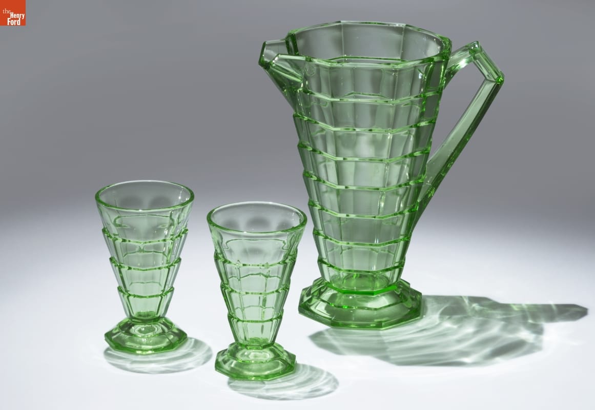 This footed pitcher and tumblers were part of a dinnerware service produced by the Indiana Glass Company of Dunkirk, Indiana. Known as "Depression Glass" these wares were distributed free, or at low cost, in the United States around the time of the Great Depression of the 1930s. The stepped or zig-zag design is the epitome of the Art Deco style, popular at that time.