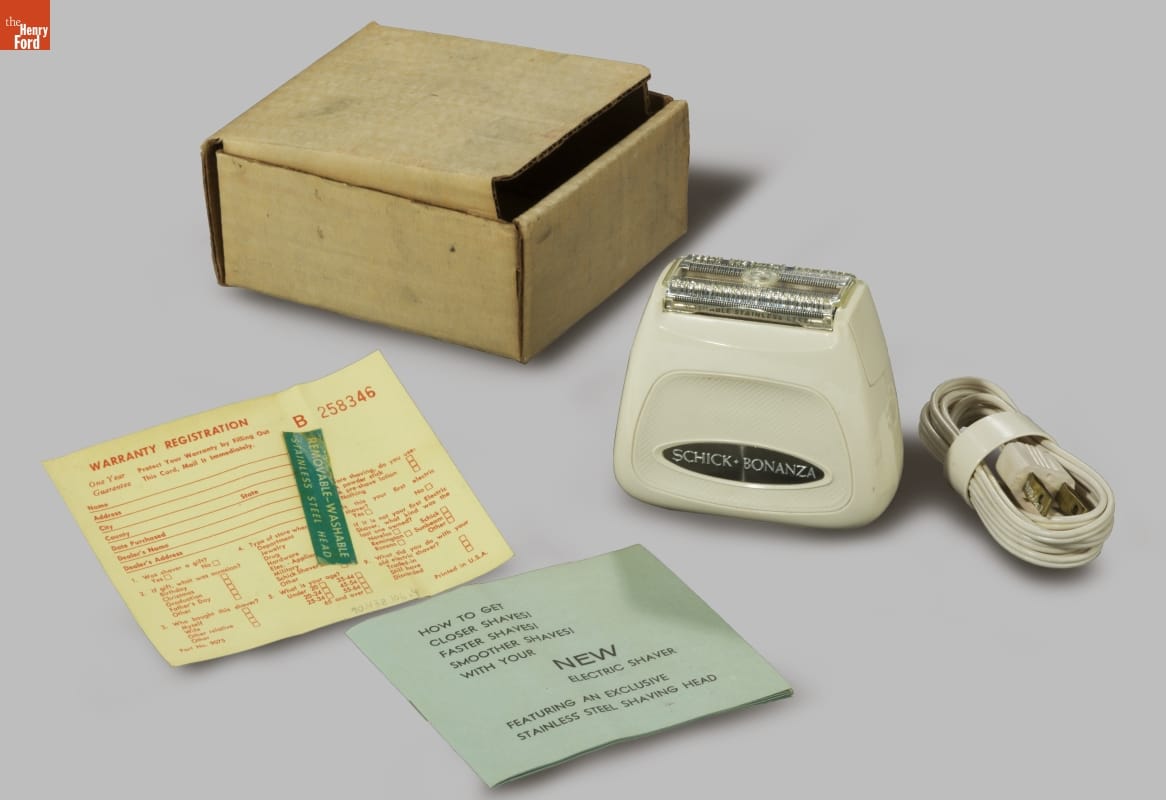 Jacob Schick patented the first successful electric razor in 1930 and began manufacturing his invention. The razors removed facial hair without lather or water, relying on an electric motor to move the cutting blades. Innovations and modern designs followed. Schick's company contracted with Mel Boldt and Associates to design the distinctive look of this razor from the 1960s.