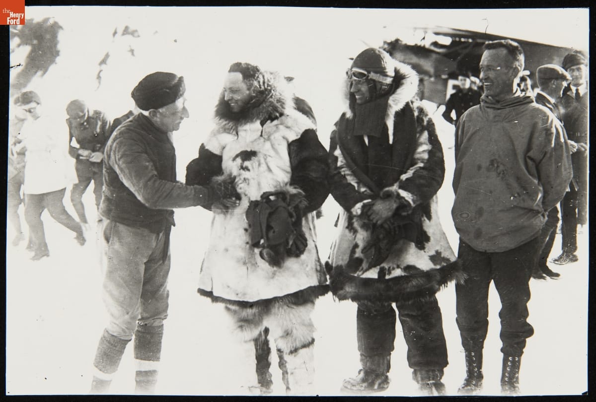 Roald Amundsen and Lincoln Ellsworth greet Richard Byrd and Floyd Bennett before the North Pole Flight, May 1926