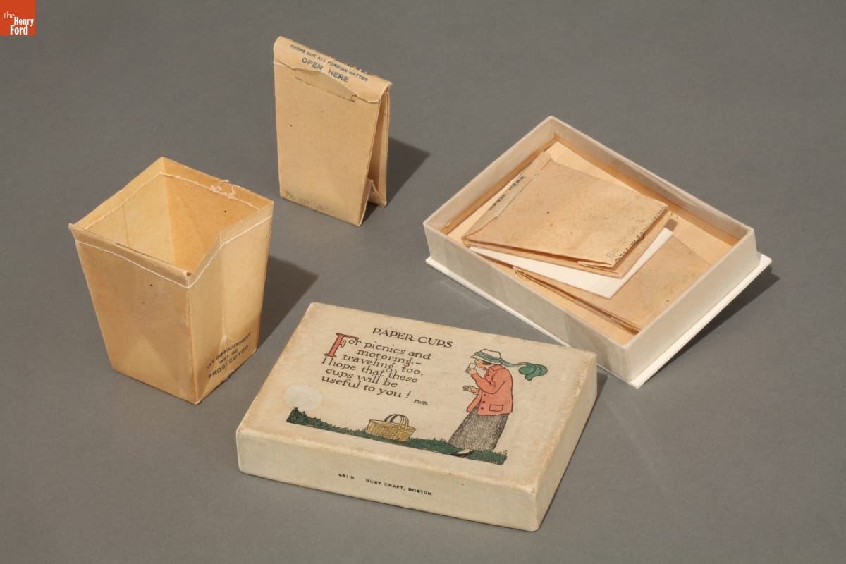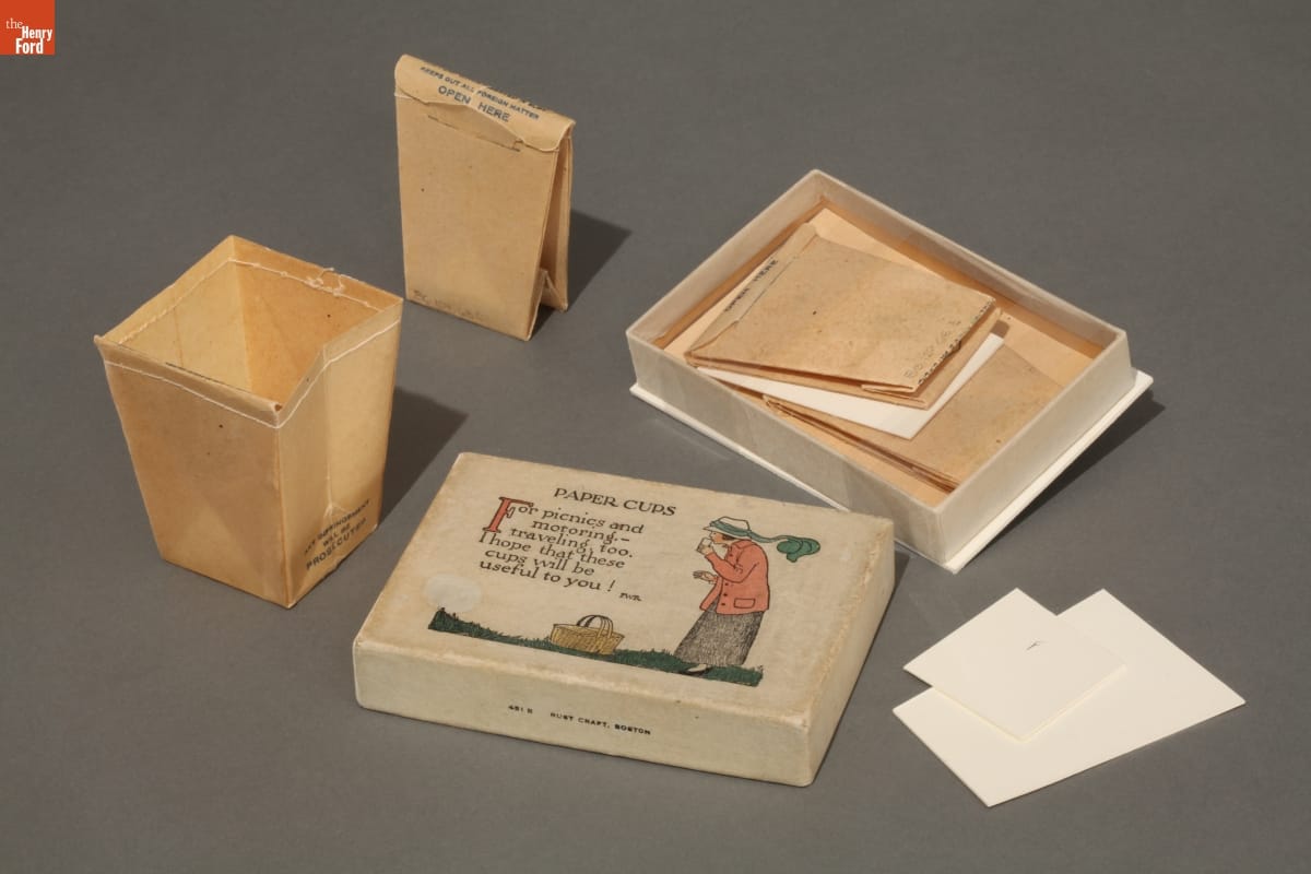 Printed on box top: PAPER CUPS / FOR PICNICS AND / MOTORING.- / TRAVELING, TOO. / I HOPE THAT THESE / CUPS WILL BE / USEFUL TO YOU! / FWR