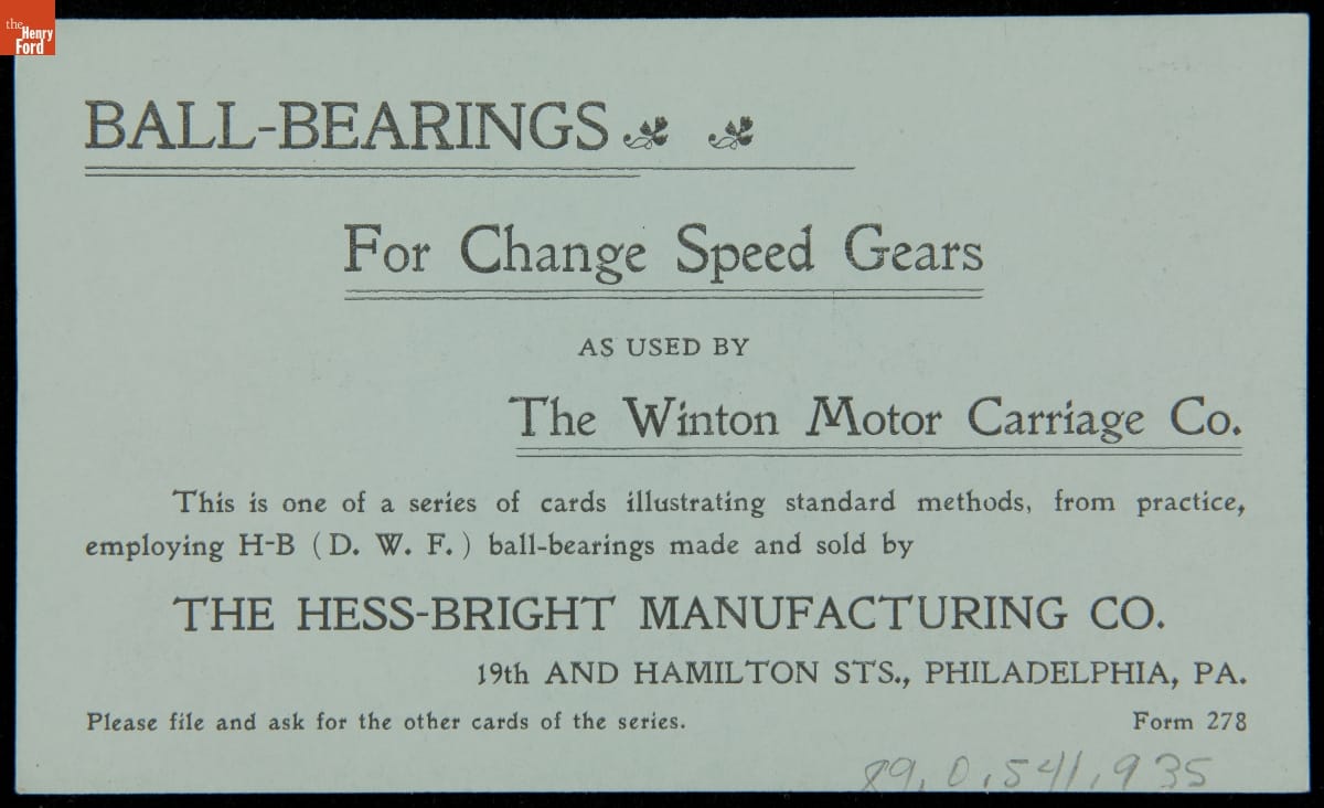 Trade Card, Ball Bearings in the Winton Change Gear, Hess-Bright Manufacturing Co., circa 1905
