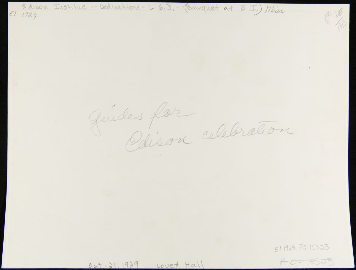 On October 21, 1929, Henry Ford hosted Light's Golden Jubilee, which celebrated the 50th anniversary of Thomas Edison's invention of a practical incandescent lamp. The event also served as the official dedication of The Edison Institute, Ford's museum complex named in honor of his friend. This photo shows Ford's employees who served as ushers at the evening banquet.