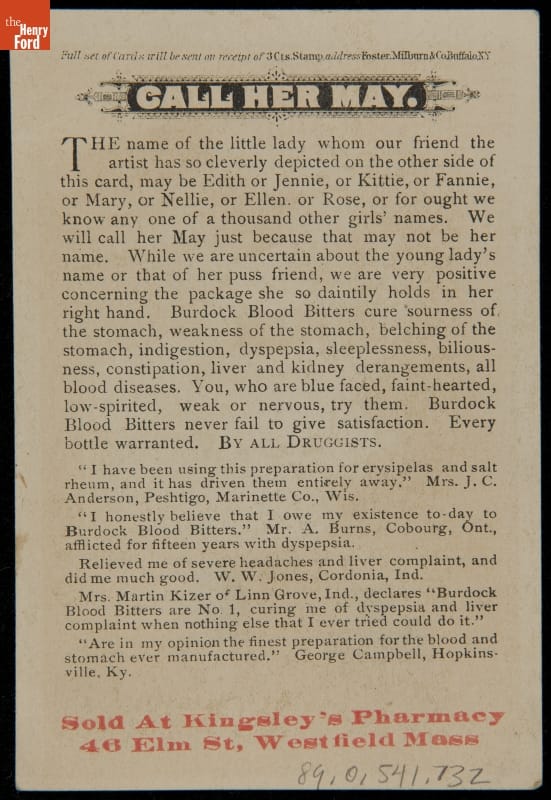Advertised products made by Foster, Milburn & Co., Buffalo, New York. Retailed by Kingsley's Pharmacy, Westfield, Massachusetts. Card lithographed by Cosack & Co., Buffalo, New York