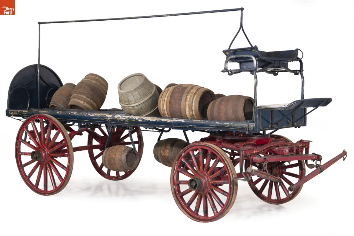 During the late 19th and early 20th centuries, horse-drawn beer wagons were familiar sights in American cities. Bars and saloons were numerous and provided places for working-class patrons to relax and socialize. This wagon's racks held beer kegs in an inward, sloping position so they wouldn't roll. The top rail supported a cover that shielded kegs from the hot sun.
