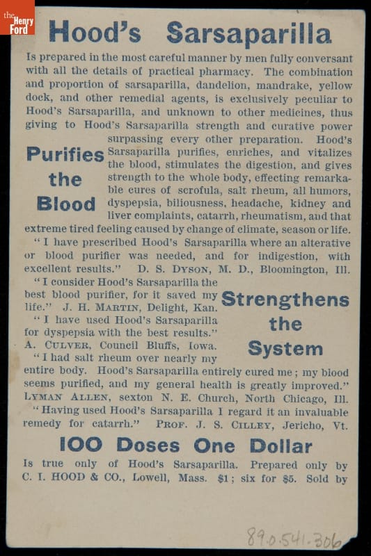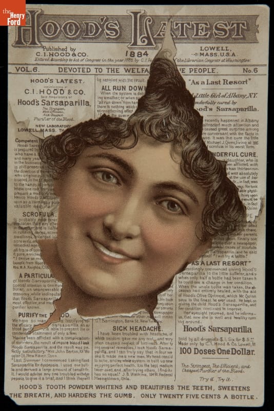 In the late 19th century, trade cards were a major means for advertising goods and services. Patent medicine producer, C.I. Hood & Co., had its own advertising department, creating cookbooks, calendars, and, most abundantly, trade cards. Hood's Sarsaparilla became the company's most popular product and trade cards, like this one, promoted its medicinal qualities as a blood purifier.