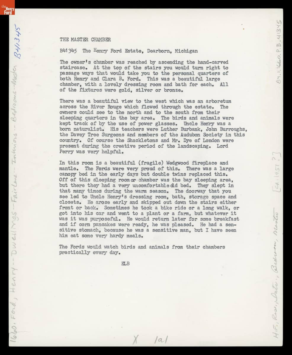 In the early 1910s, Henry and Clara Ford selected 1300 acres of farmland in Dearborn, Michigan, as the site for a new house -- shunning the eastern suburbs chosen by many of Detroit's wealthy citizens. In 1916, the couple moved into their newly constructed 31,000-square-foot home. The mansion contained 56 rooms including seven bedrooms, fifteen baths, and other standard living spaces.