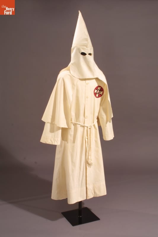 The Ku Klux Klan's robe and hood veiled the organization in secrecy. During the 1920s, the date of this robe, Klansmen hidden behind this regalia could carry out unchecked terror on African Americans, Catholics, Jews, and immigrants. The robe and hood instilled fear on its victims and a sense of power to its wearers.