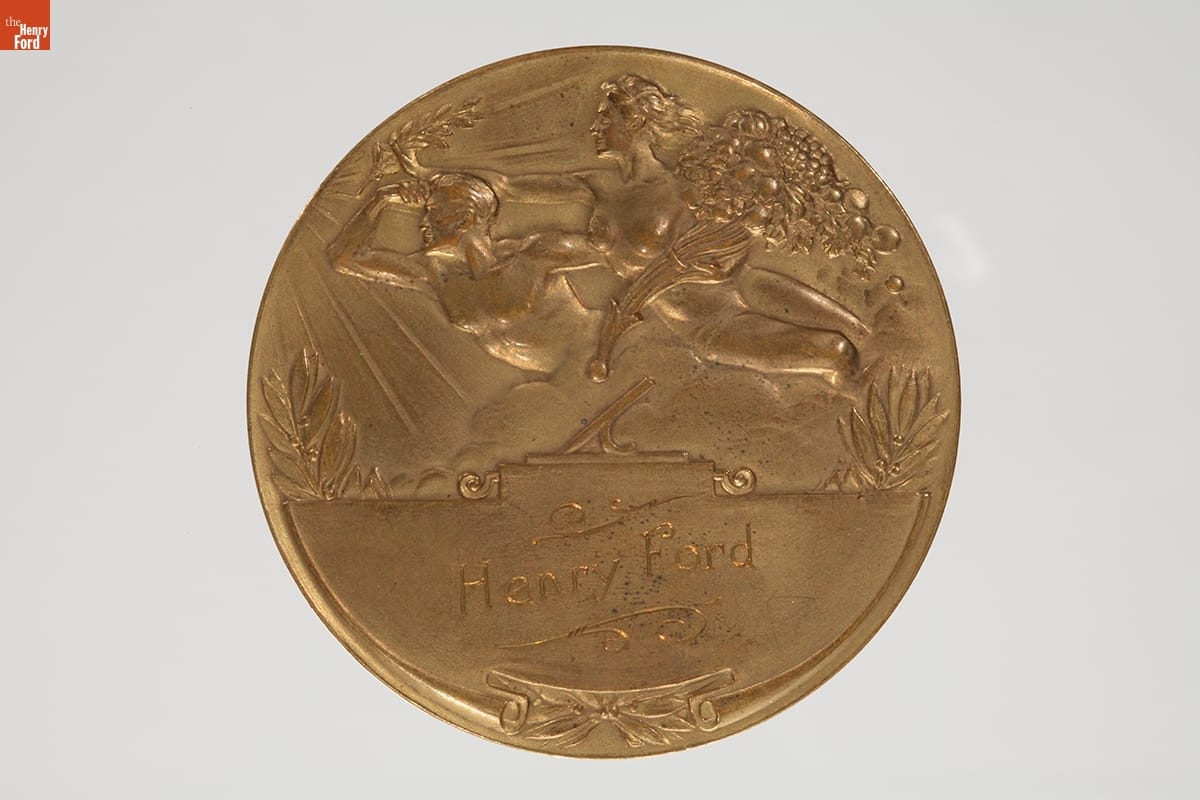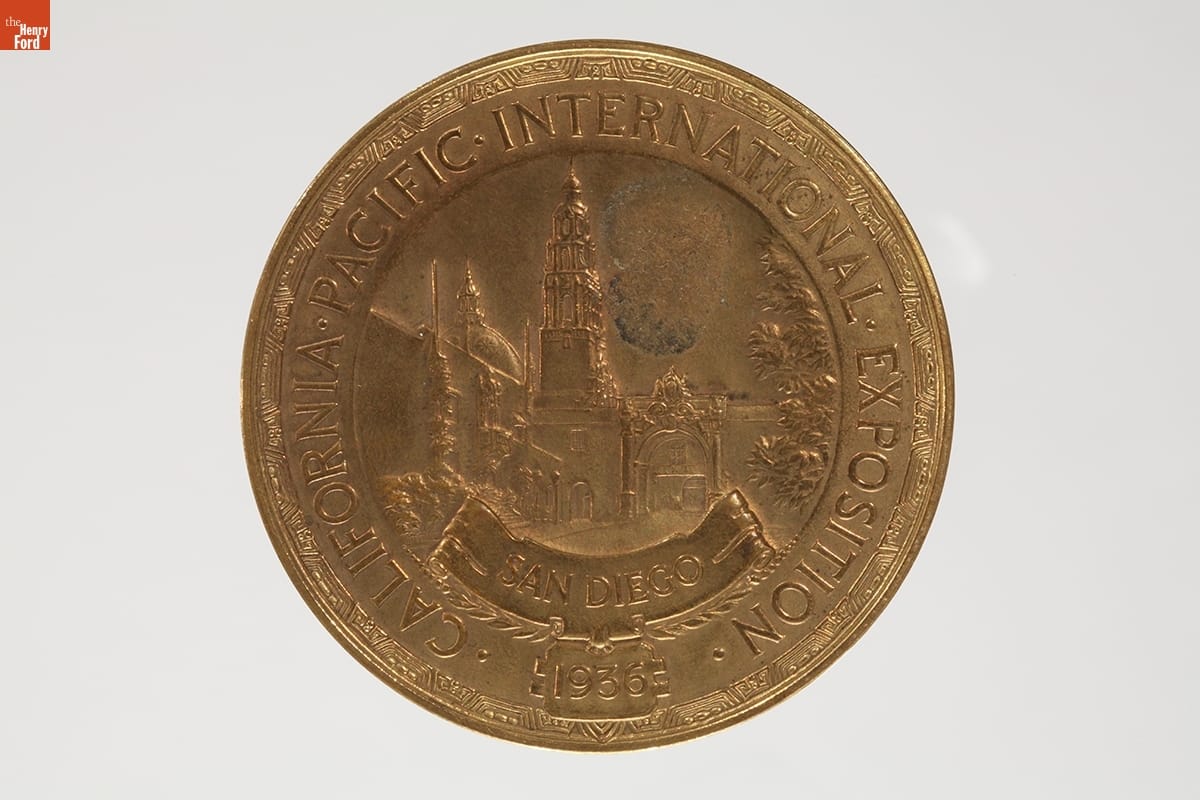 Ford Motor Company poured resources into the 1935-1936 California Pacific International Exposition in San Diego, constructing the fair's largest and most popular exhibition. It included information on automobile manufacturing methods and materials, displays of new car models, and an outdoor "Roads of the Pacific" driving course. This commemorative medal from the event was presented to Henry Ford.