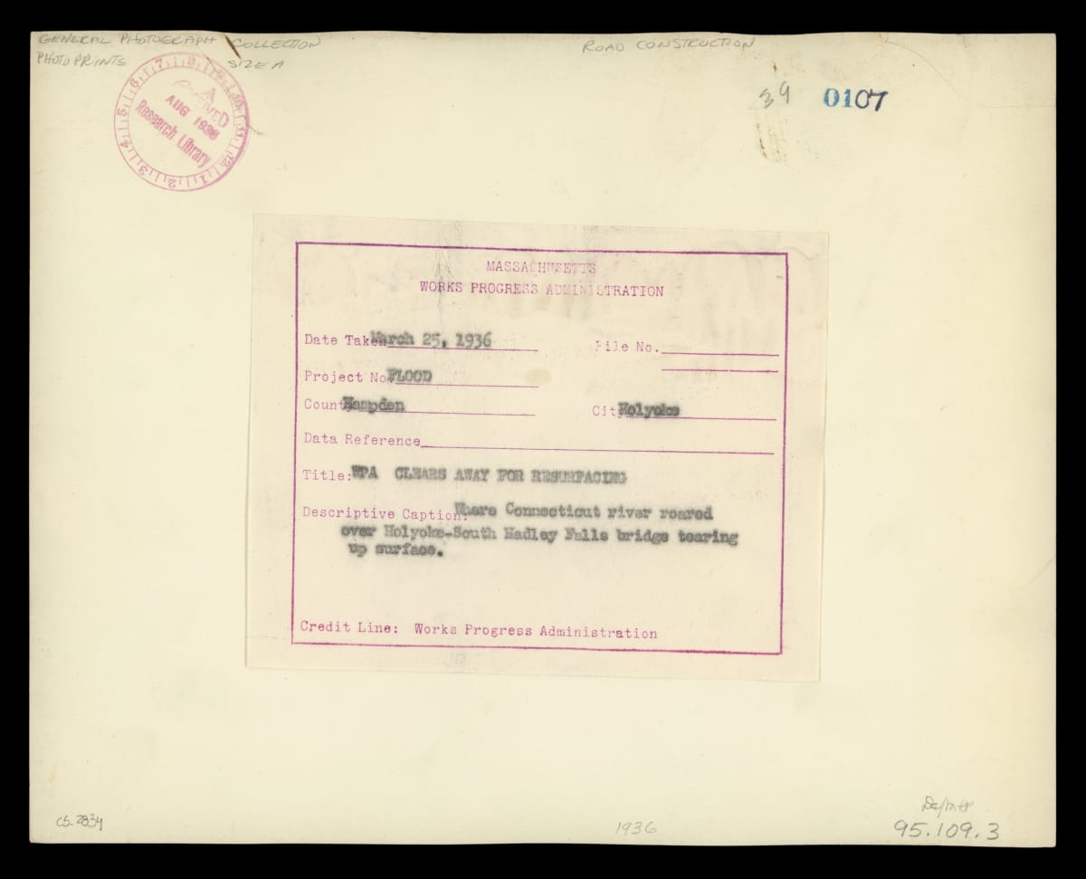 MASSACHUSETTS / WORKS PROGRESS ADMINISTRATION / Date: March 25, 1936 / Project No.: FLOOD / County: Hampden City: Holyoke / Title: WPA CLEARS AWAY FOR RESURFACING /