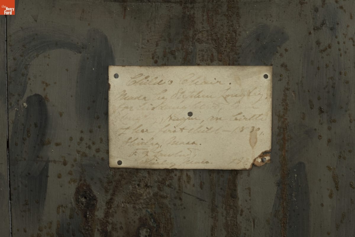Child's Chair. / Made by Stephen Longley, / for his daughter Ann (Longley) / Hazen, on birth / of her first child - 1830 / Shirley, Mass. / F. G. Loveland [or Leeland] / Shirley, Mass.