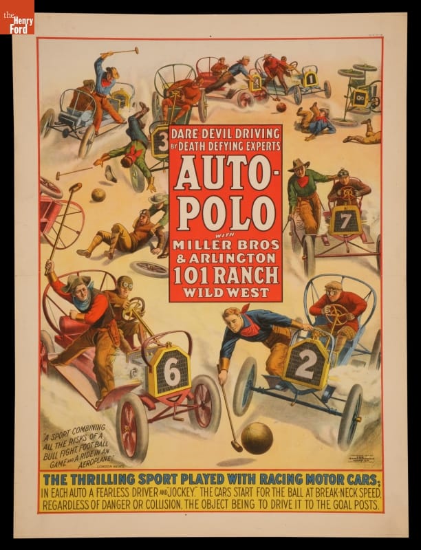 Poster reads: DARE-DEVIL DRIVING / By DEATH DEFYING EXPERTS / AUTO- / POLO / with / MILLER BROS / & ARLINGTON / 101 RANCH / WILD WEST