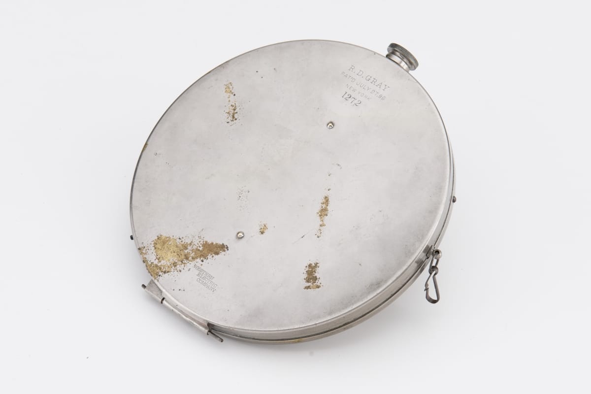In 1885, Robert D. Gray created one of the earliest commercial spy cameras. It was designed for concealment: worn under a shirt, with the small lens protruding from a button hole. The spring shutter on the flat disc could be triggered with little suspicion. After each image was taken, the glass plate inside the disc rotated, producing small round photographs.