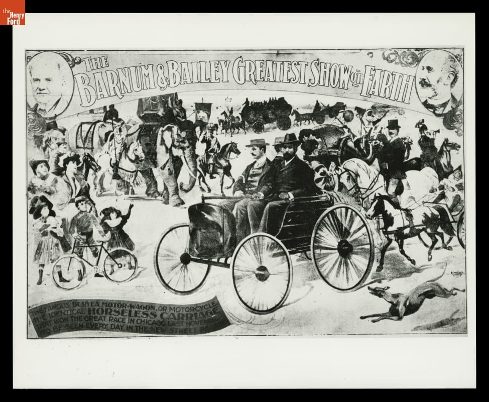 THE BARNUM & BAILEY GREATEST SHOW ON EARTH [continued on lower left corner:] THE FAMOUS DURYEA MOTOR-WAGON, OR MOTORCYCLE. THE IDENTICAL HORSELESS CARRIAGE THAT WON THE GREAT RACE IN CHICAGO LAST NOVEMBER. TO BE SEEN EVERY DAY IN THE NEW STREET PARADE.