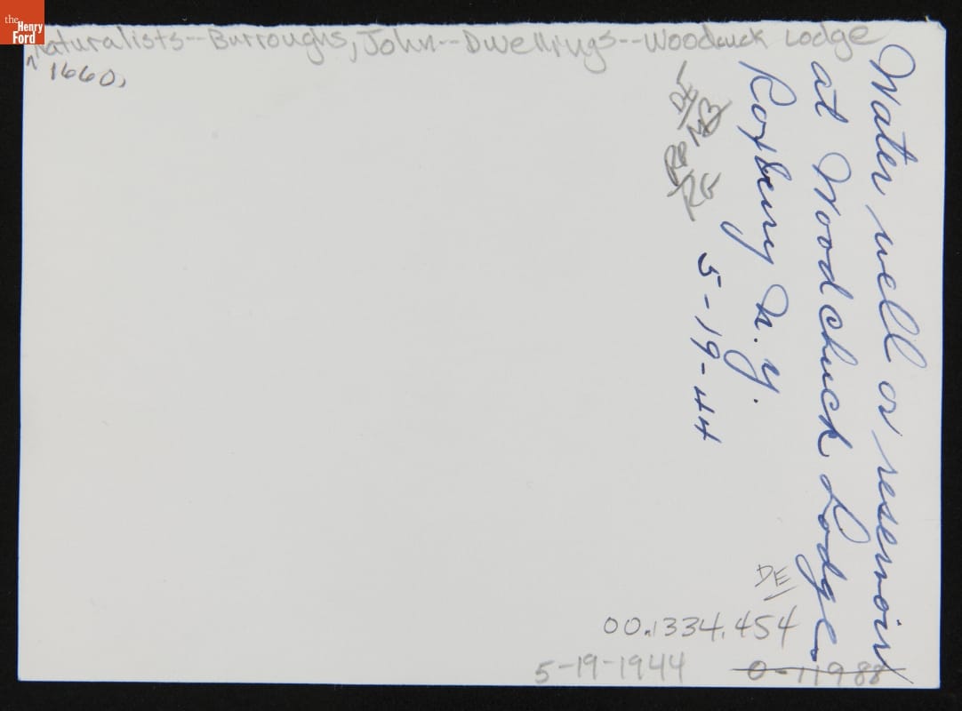 John Burroughs (1837-1921) was an internationally known naturalist and essayist. In 1913, with financial assistance from Henry Ford, Burroughs purchased the house built by his brother Curtis on land near Burroughs's birthplace in Roxbury, New York. Woodchuck Lodge, as Burroughs referred to it, became his summer retreat. Henry Ford purchased the property after Burroughs's death. It was sold back to the Burroughs's son, Julian, in 1947.
