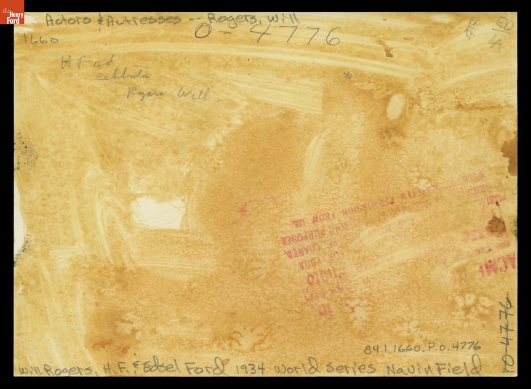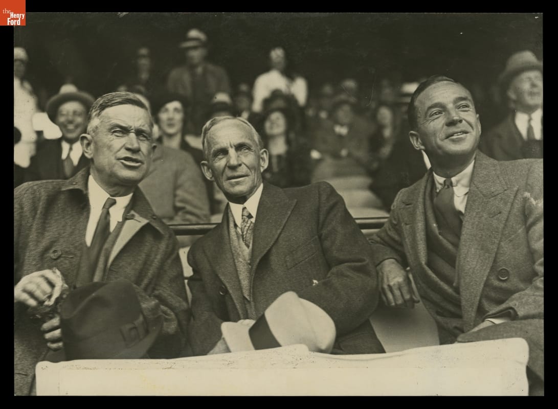 Will Rogers, Henry Ford, and Edsel Ford Watching the World Series at Navin Field, 1934