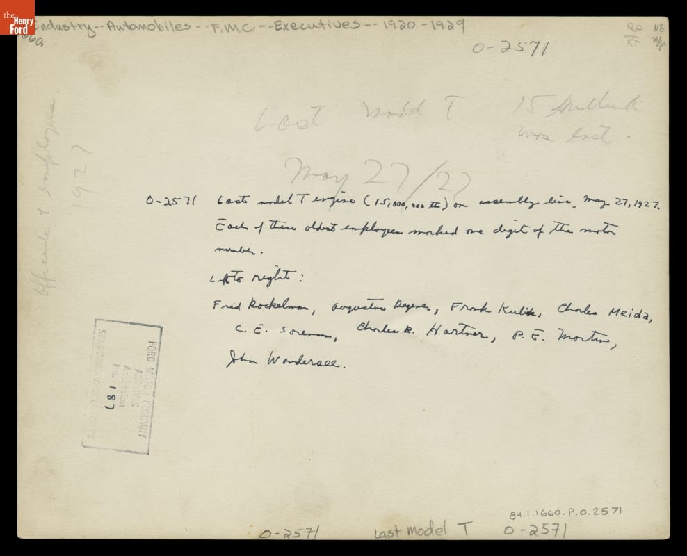 The assembly of the fifteen millionth Model T, the ceremonial "last" Model T, was a major event for Ford Motor Company. The automaker's eight senior-most employees -- Fred Rockelman, Gus Degener, Frank Kulick, Charles Meida, Charles Sorensen, Charles Hartner, P.E. Martin, and John Wandersee -- each hand-stamped one of the serial number's eight digits into the engine's number plate.