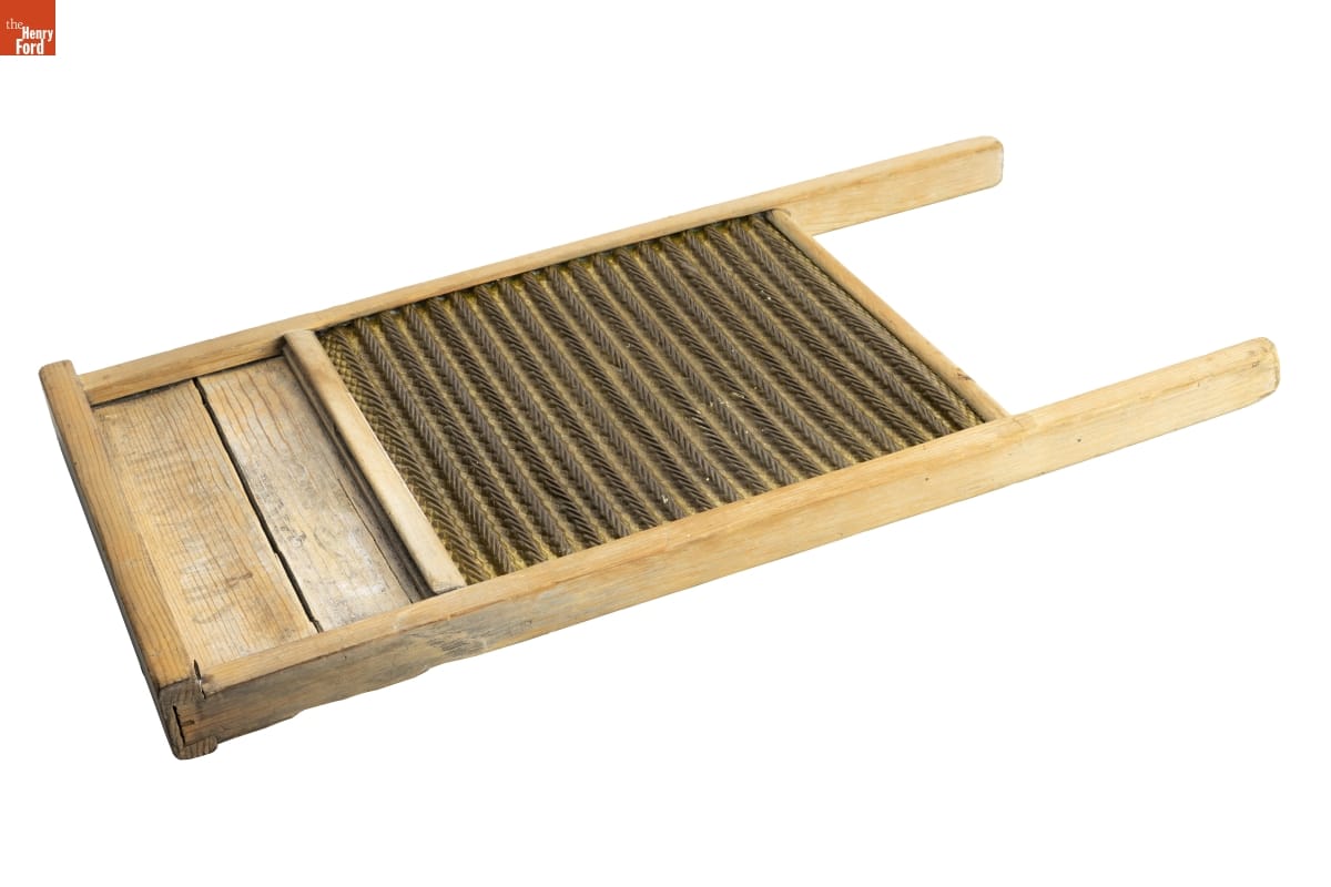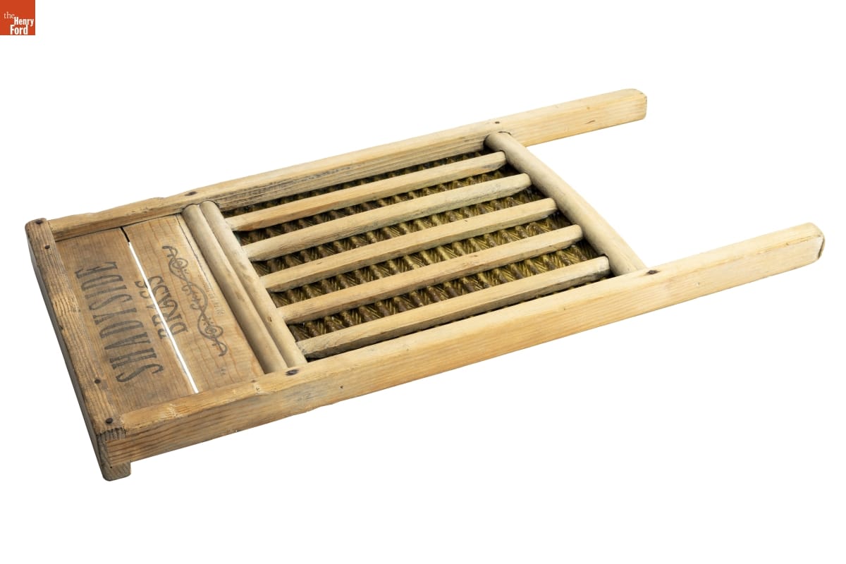 Before mechanized washing machines, doing laundry was perhaps a homemaker's least favorite job. The work began by heating gallons of water, often lugged to a waiting laundry tub. Next, the homemaker scrubbed the dirty clothes clean on textured washboards like this before rinsing and wringing clothes before hanging them to dry. The sometimes days-long process was backbreaking and time-consuming.