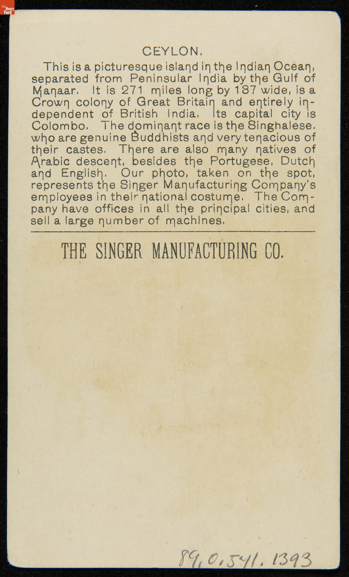 As color printing gained momentum in the late 19th century, trade cards became a major means of advertising goods and services. Americans enjoyed and often saved the vibrant little advertisements found in product packages or distributed by local merchants. The Singer Sewing Machine Company had a series of trade cards, like this one, offering images of Singer machine users from around the world in their national dress.