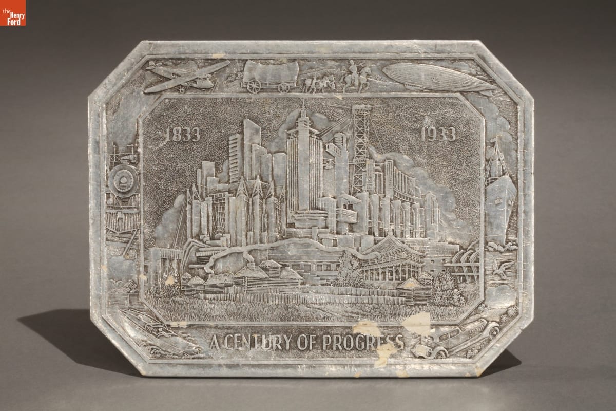 Chicago's 1933-34 Century of Progress Exposition used the theme of progress to buoy national optimism during the darkest years of the Great Depression. Many fairgoers returned home with mementos, such as this coaster depicting landmarks from the exposition.