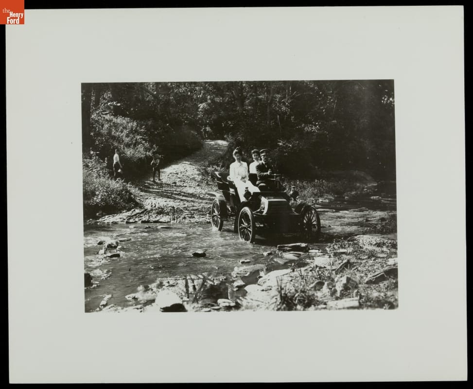 In the 1800s, horses carried Americans to places railroads and waterways did not go. The arrival of the automobile in the early 1900s brought a promise for something new -- if not better. Though the earliest cars were only accessible to the wealthy, these well-dressed women crossing a rocky stream with their chauffeur foreshadow an imminent shift in American transportation.