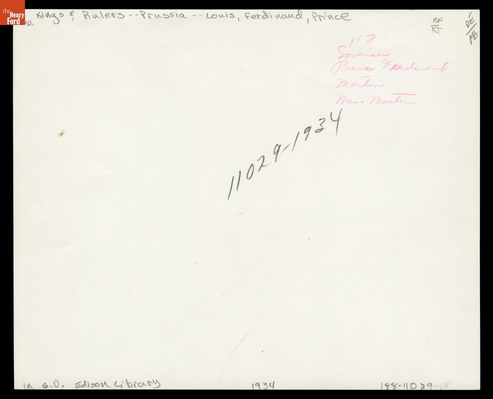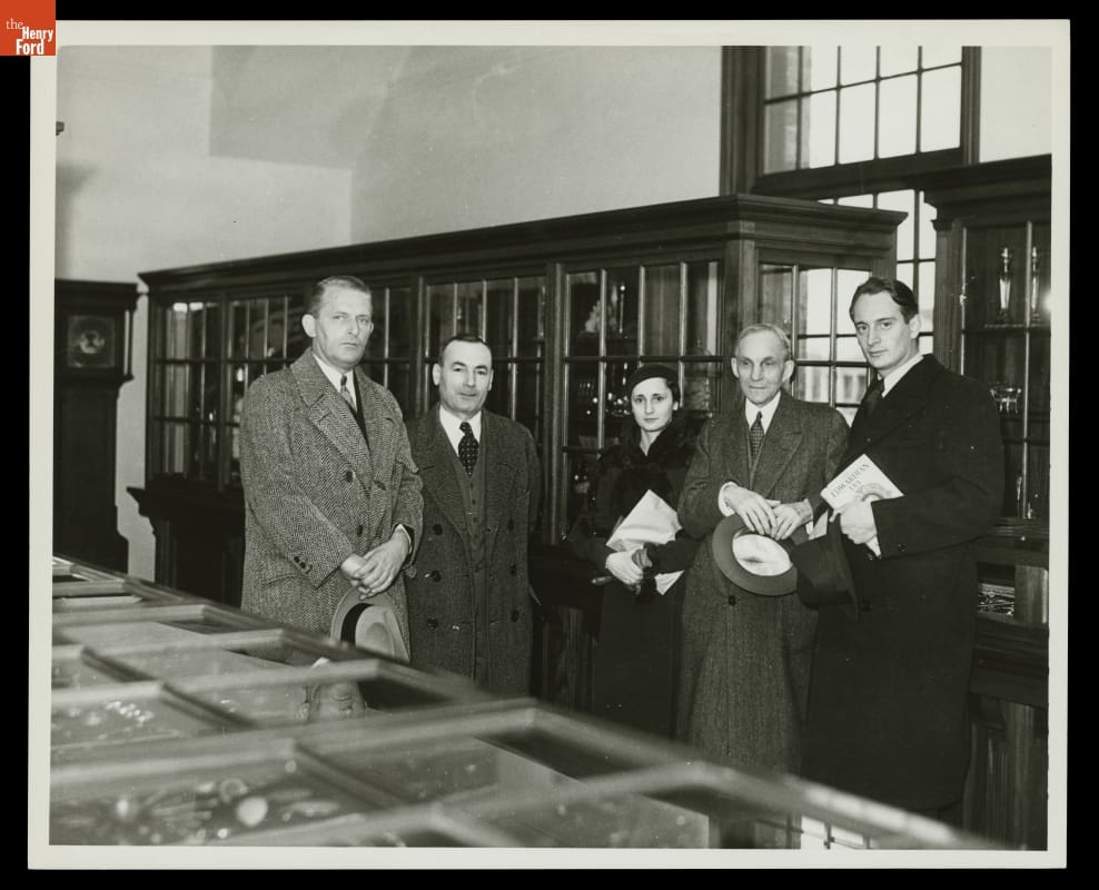 Henry Ford, a watch enthusiast, purchased Sir John Bennett's clock, watch and jewelry store in 1928. The building stood five stories in London, England, but was reassembled into a two-story structure to better fit the scale of Ford's Greenfield Village. This photo shows Ford with Prince Louis Ferdinand of Prussia (on the far right) touring the building and the viewing the display of watches.
