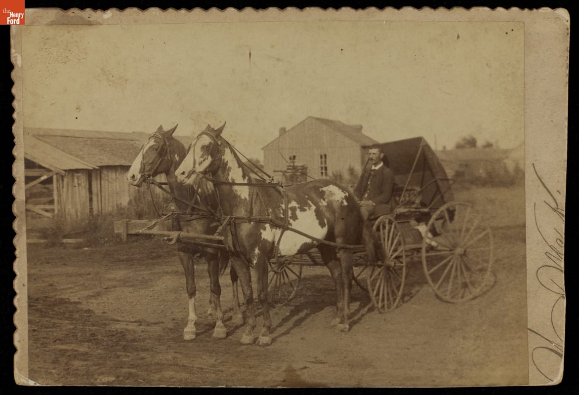 Professional photographers began producing cabinet cards in 1867, and people soon preferred these photographic prints on cardboard stock to the earlier, smaller cartes-de-visite. American commonly collected and exchanged cabinet photographs through the early 1900s. This example from around 1880 shows a man in a horse-drawn buggy.