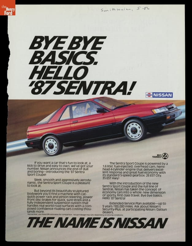 "Bye Bye Basics. Hello '87 Sentra!" Nissan Sentra Sport Coupe Advertisement, 1987
