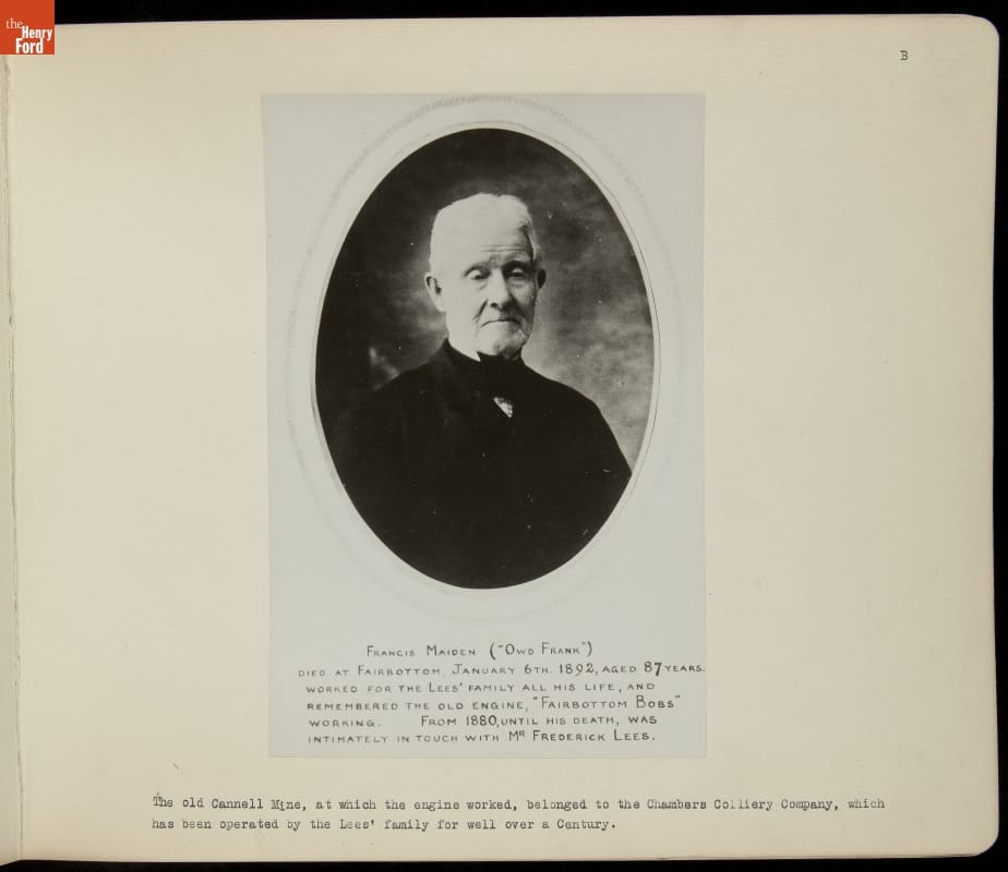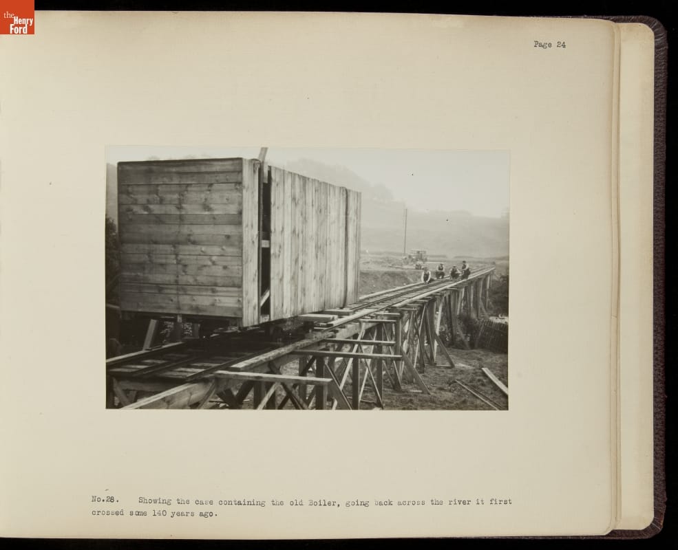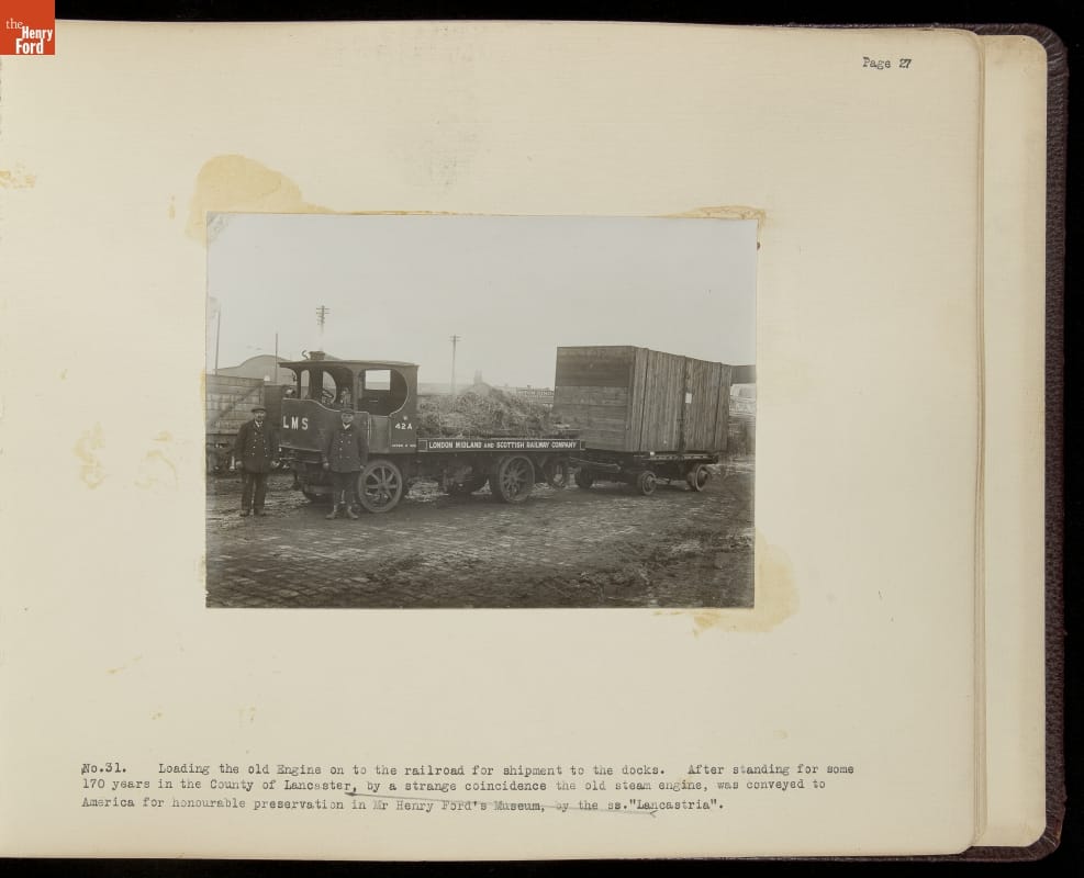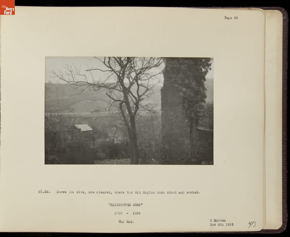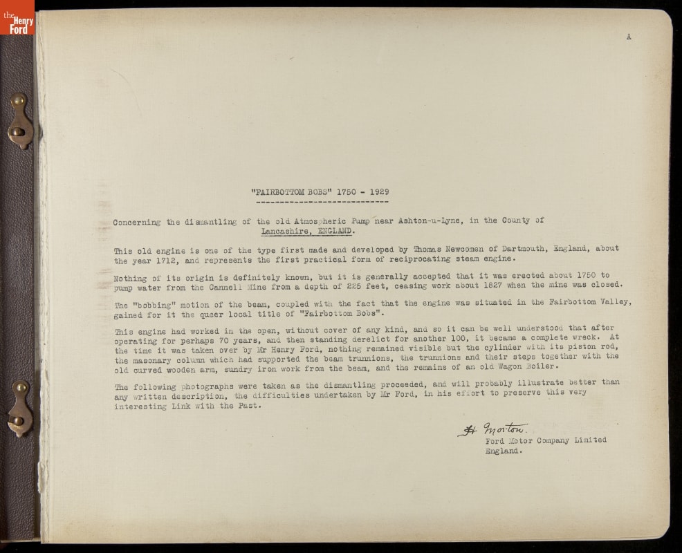 Henry Ford acquired the oldest known surviving steam engine in 1929. The engine, known locally as Fairbottom Bobs, lay in ruin near Ashton-under-Lyne, England. Ford charged Herbert Morton to dismantle, crate, and transport what remained of the original engine to Dearborn, Michigan. This album chronicles Morton's experience, which included an archeological dig, building a bridge, and laying a short railroad.
