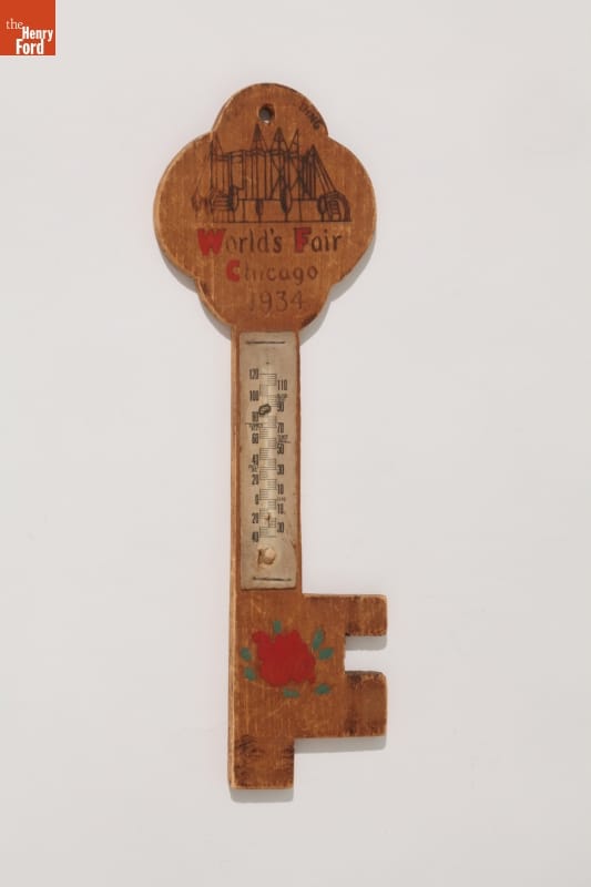 Chicago's 1933-34 Century of Progress Exposition used the theme of progress to buoy national optimism during the darkest years of the Great Depression. Many fairgoers returned home with mementos, such as this thermometer plaque depicting the Travel and Transport Building--one of the exposition's major exhibition buildings.