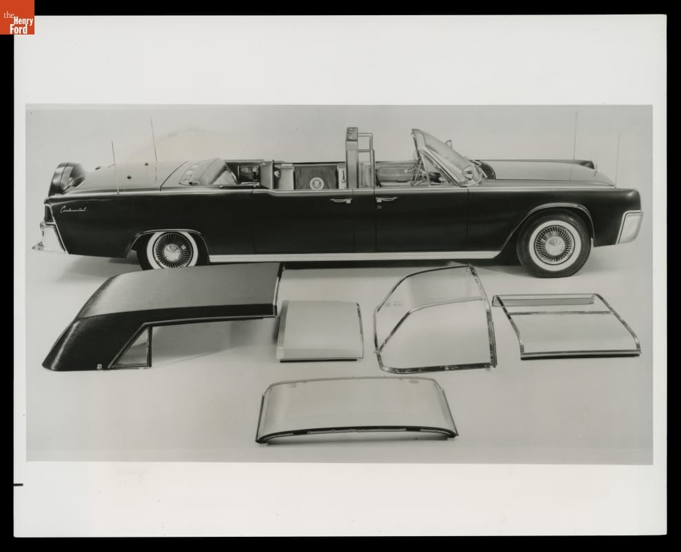As originally built, the 1961 Lincoln Continental Presidential Limousine had three different roof options. A removable steel section provided privacy, clear plastic sections provided weather protection, and a completely open top gave the president maximum visibility. The plastic panels fit neatly into the trunk and were available whenever needed. None of the removable tops was armored.