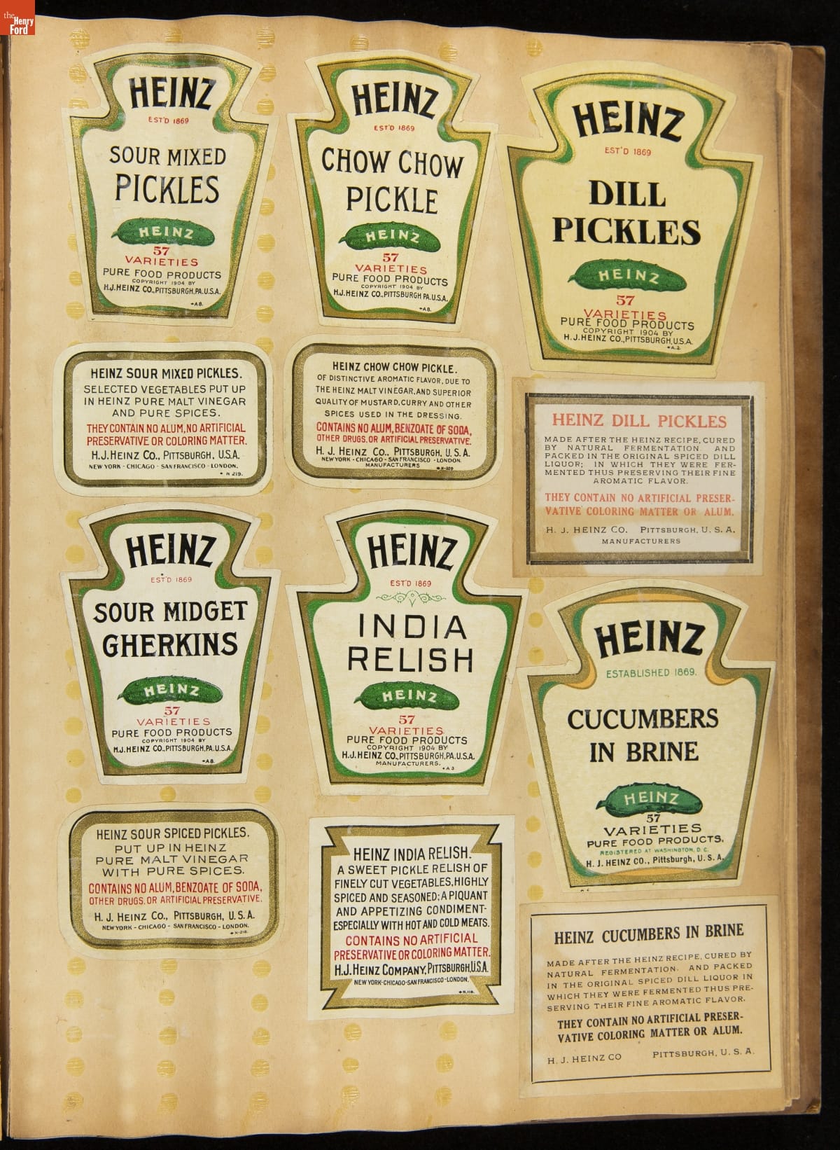 While "57 Varieties" became the well-known slogan for the H.J. Heinz Company, it actually produced more than 60 different products. This scrapbook provides a glimpse of some labels for the products produced by Heinz in the early twentieth century.