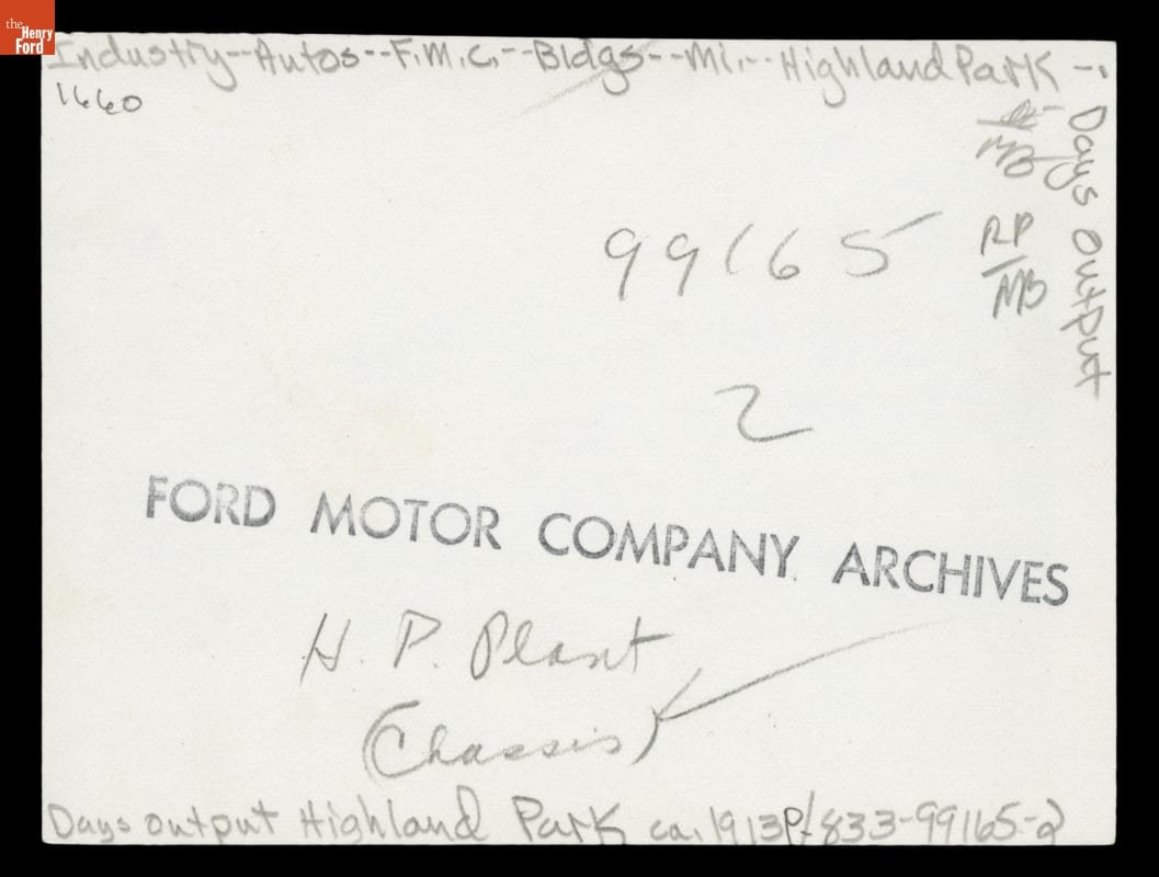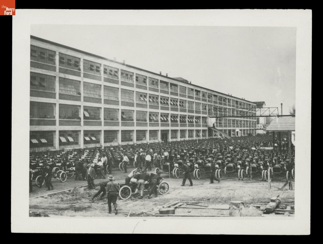 Ford Motor Company's Highland Park plant hummed with activity during the 1910s. With the introduction of the moving assembly line, the plant went from building some 200,000 Model Ts in 1913 to more than 820,000 in 1919. Here workers are seen lining up chassis outside the plant for a publicity photo. The final shot showed 1,000 chassis -- one shift's production in 1913.