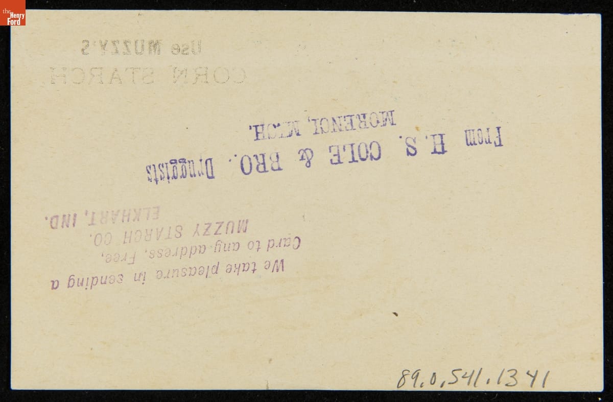 As color printing gained momentum in the late 19th century, trade cards became a major means of advertising goods and services. Americans enjoyed and often saved the little advertisements found in product packages or distributed by local merchants. This trade card advertises Muzzy's Corn Starch.