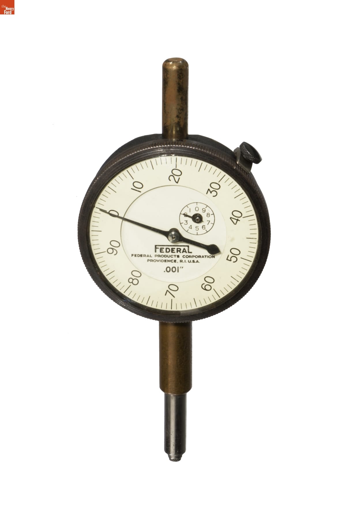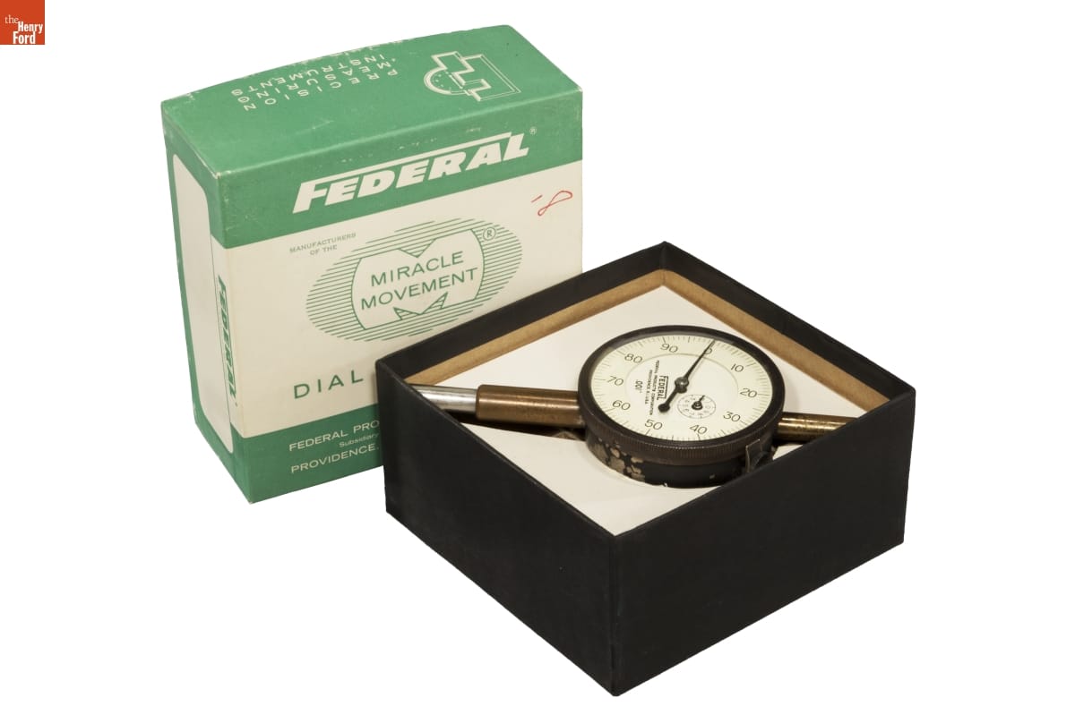 Dial indicators provide accurate measurements of parts used in a number of manufacturing processes. The large numbers on the indicator's face make small, imperceptible dimensions visible. Operators compare these measurements against a standard and make corrections if any deviation is found. The Federal Products Corporation made a variety of precise measuring devices in the 20th century.