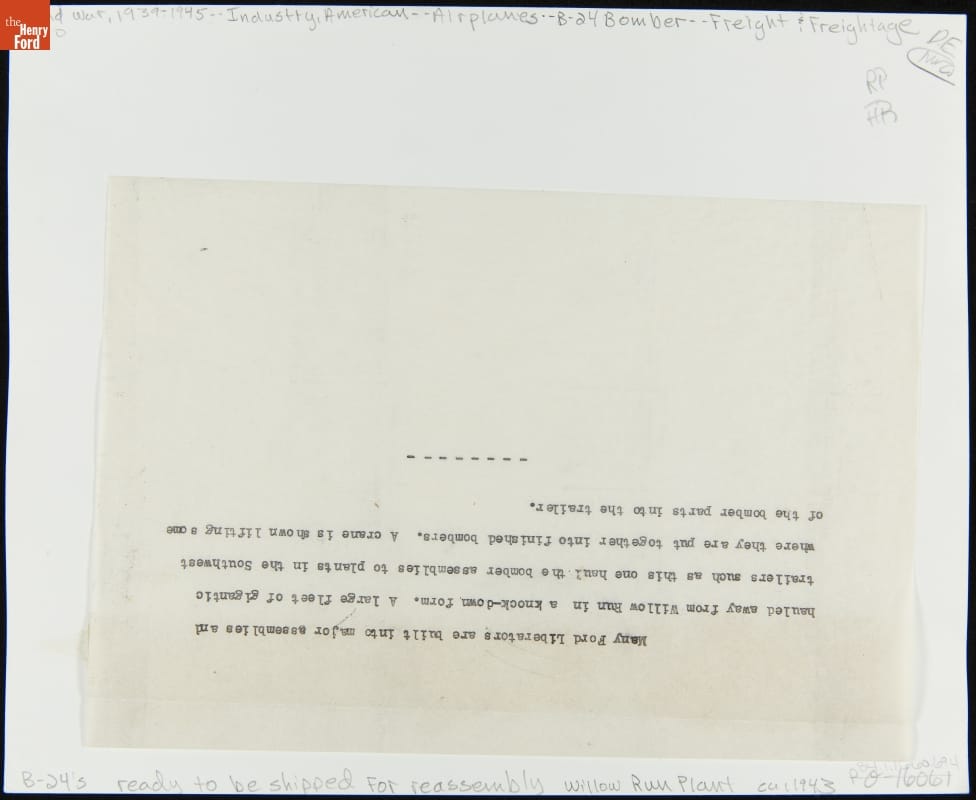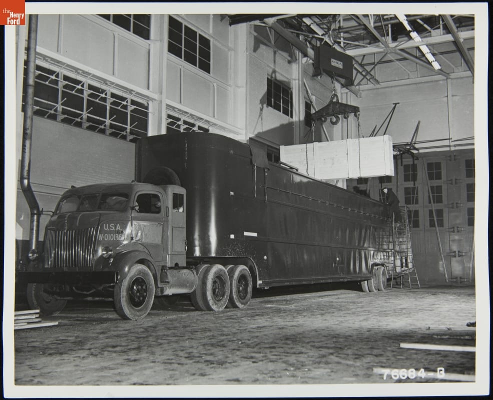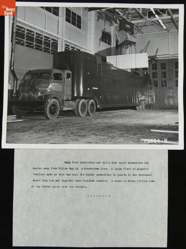 Not every B-24 bomber built at Ford Motor Company's Willow Run plant left the facility as a completed airplane. Some 1,800 bombers were sent as partially assembled kits to Consolidated Aircraft Corporation in Fort Worth, Texas, or Douglas Aircraft in Tulsa, Oklahoma. The components for each plane were packed into two specially designed semi-trailers for transport to these final assembly plants.