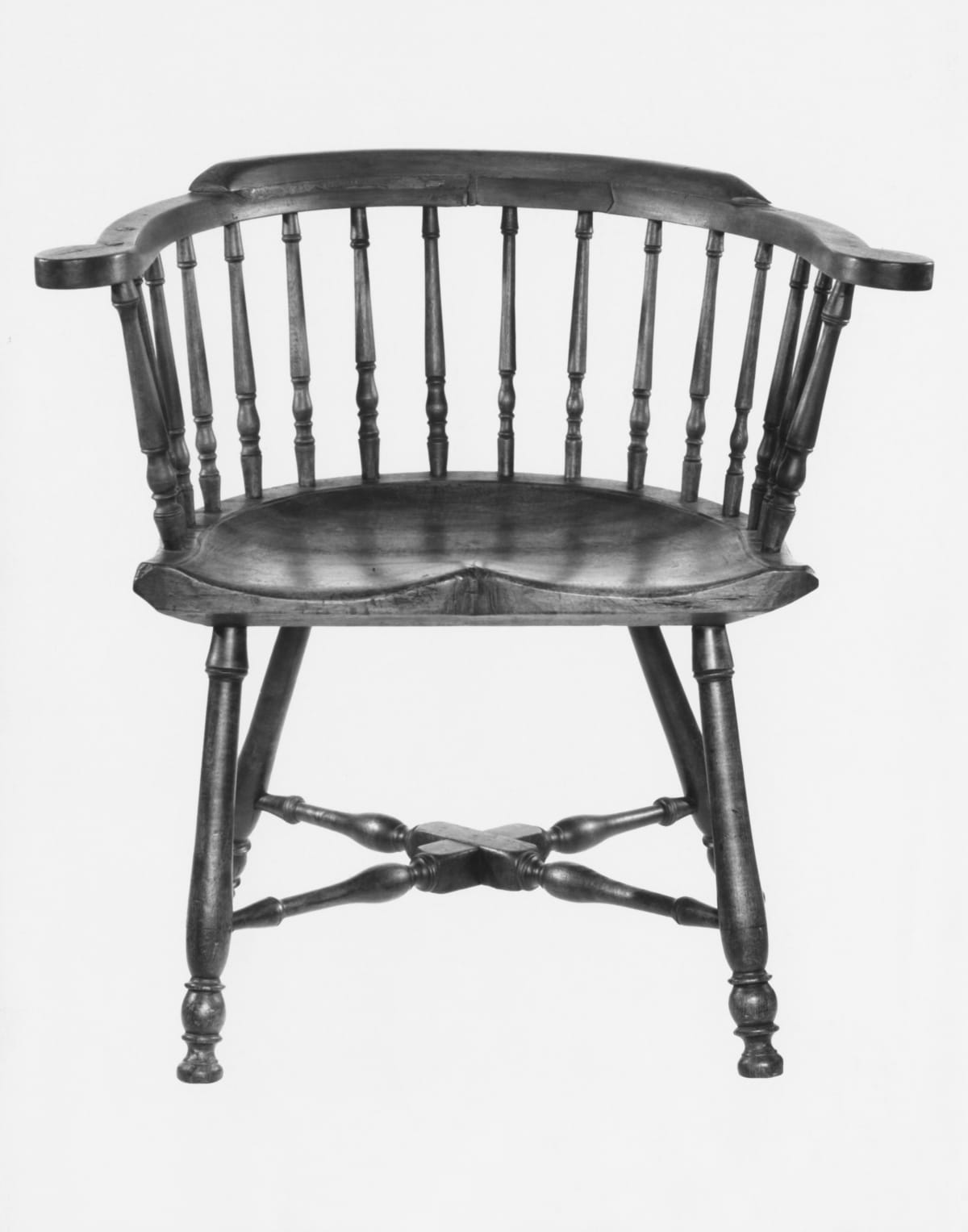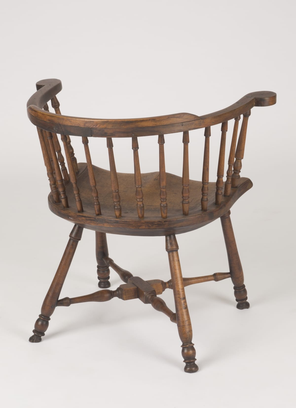 Windsor chairs began to appear in American homes in the mid-18th century, and they are still being made today. When first introduced, they were used in every room of the house -- but especially in public spaces because they were so sturdy and inexpensive. Windsor chairs also came in various styles and types. Some with steam-bent back rails; others, like this "low-back," with a carved, two-piece armrest.