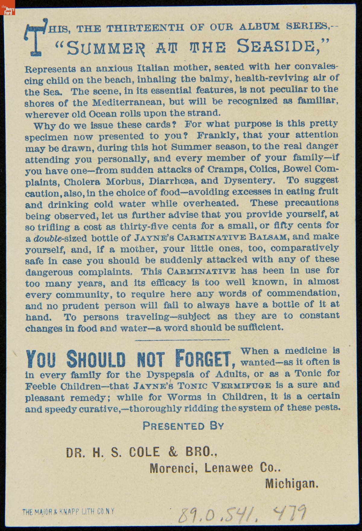 Trade Card for Dr. Jayne's Patent Medicines, "Summer at the Seaside," 1880-1900