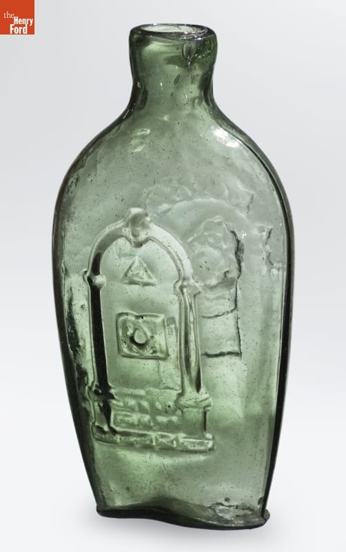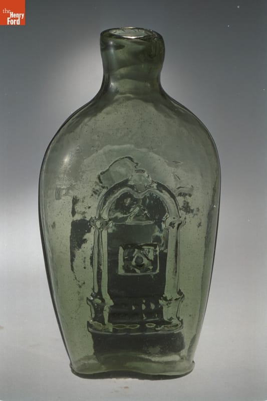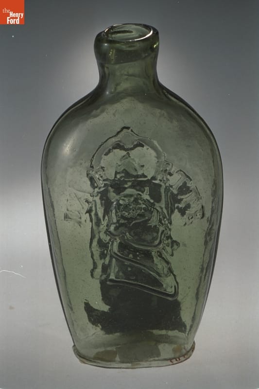 Glass factories in America began producing inexpensive, mold-formed flasks in the early 1800s. These figured flasks, often decorated with symbols of national pride or political or cultural affiliation, appealed to America's common man. In the mid-1820s, General Lafayette, a French aristocrat who helped America win its independence, revisited the United States. His image adorned flasks commemorating his tour.