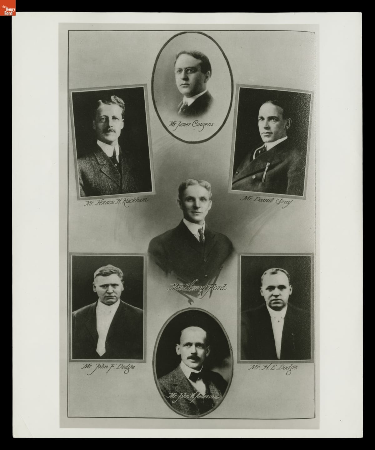 Seven of Ford Motor Company's most prominent stockholders were pictured in this image from 1911. Over the following years, Henry Ford methodically and clandestinely bought up shares from minority stockholders until he obtained a controlling interest. When the task was finished in 1919, Mr. Ford at last had complete control of Ford Motor Company.