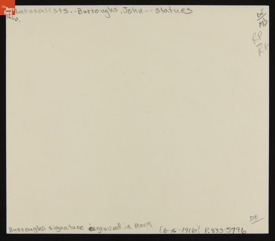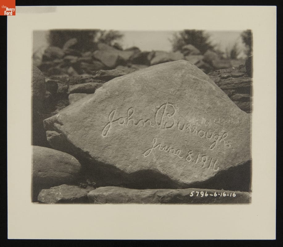 Henry Ford befriended naturalist John Burroughs in the early 1910s. The two shared a mutual love of birds and nature. In 1916, Ford dedicated a wildlife shrine to Burroughs at Fair Lane, Ford's home in Dearborn, Michigan. The "Burroughs Grotto" contained a heated bird bath, a statue of the Burroughs, and this stone with the signature of the famed naturalist.