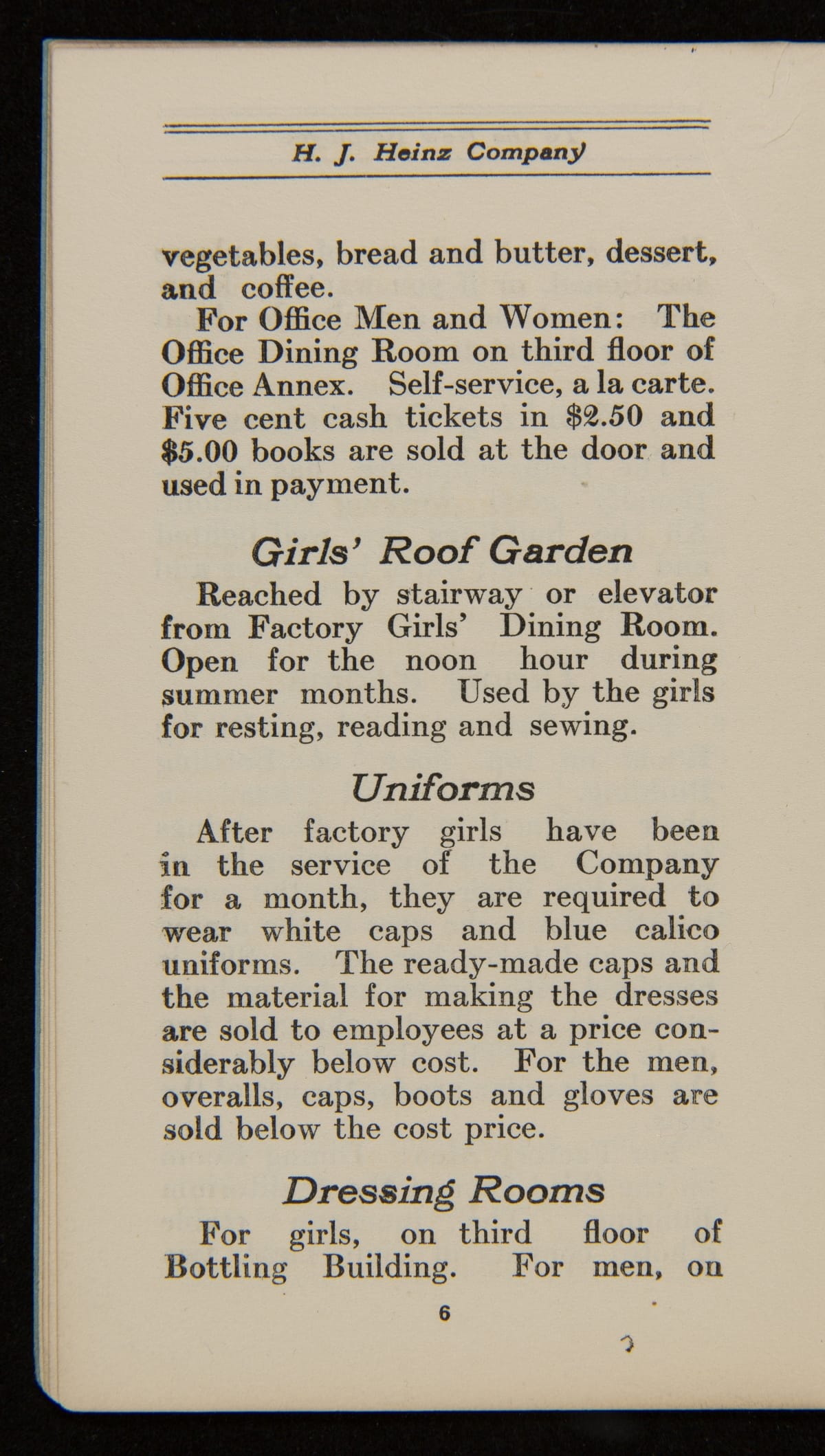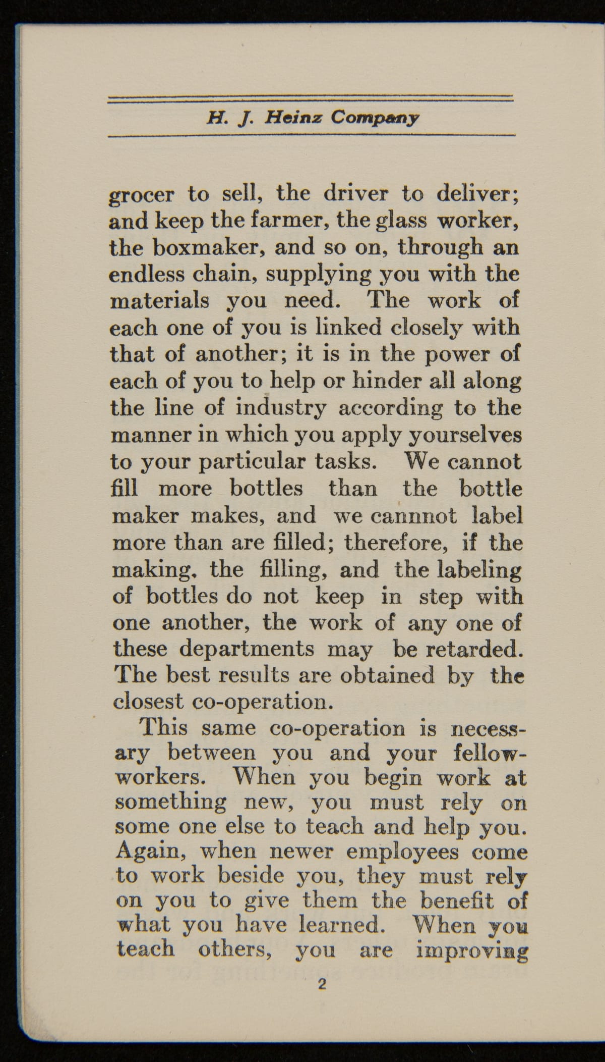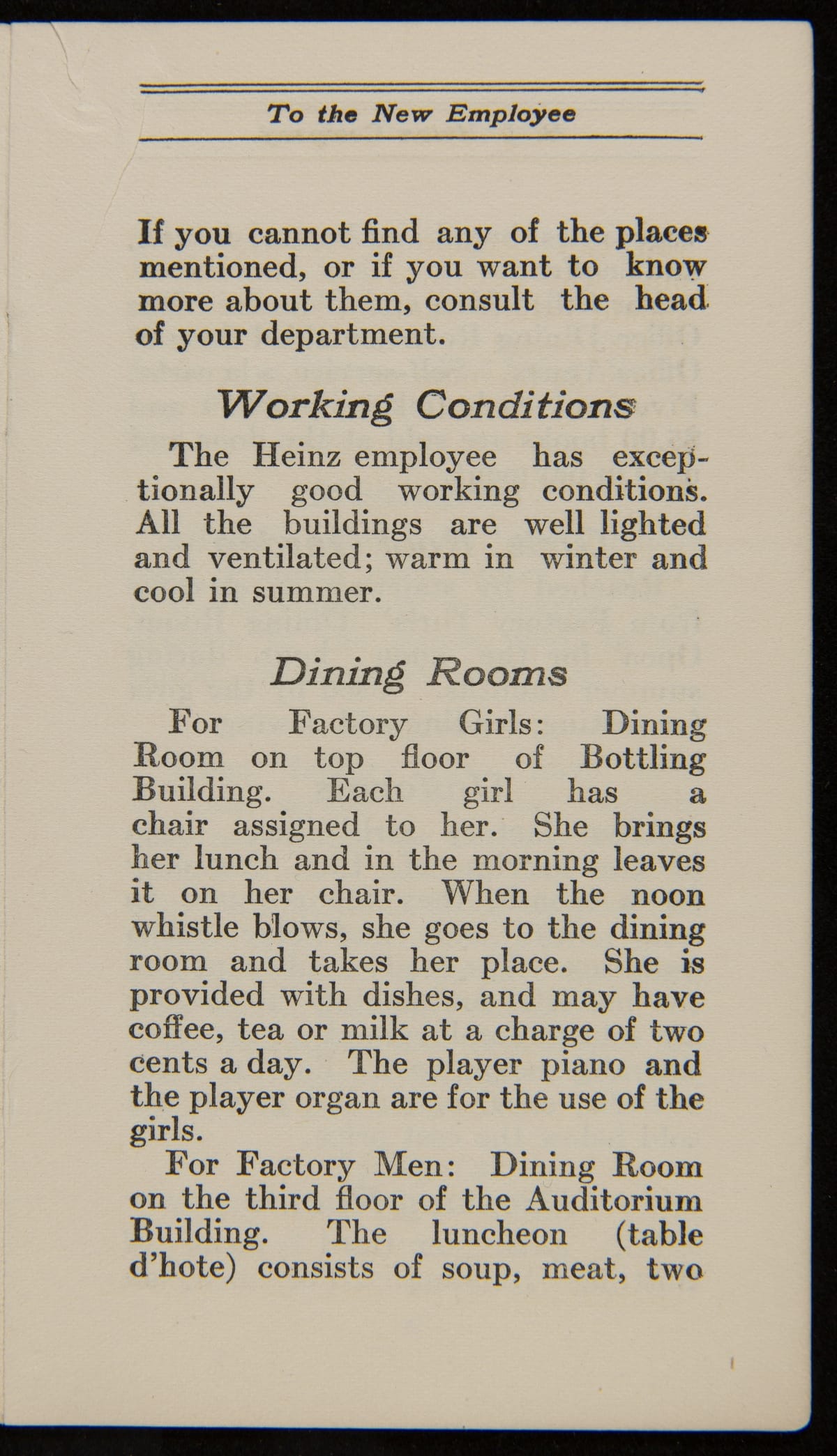 From its founding, a guiding principle of the H.J. Heinz Company was to promote strong company relationships with its employees. This resulted in a world-class employee welfare program which included amenities, programs, and policies with consideration for their well-being. This employee handbook from 1920 explains each of these provisions and encourages teamwork and a strong personal work ethic from the incoming employee.