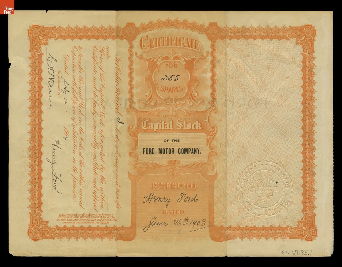 This is one of the first shares of Ford Motor Company stock. It was issued to Henry Ford, who had failed twice before to establish a successful automobile company. In his third attempt, Ford had the crucial support of Alexander Malcomson, a wealthy Detroit coal merchant. Malcomson was vital in finding additional investors for Ford's new enterprise.