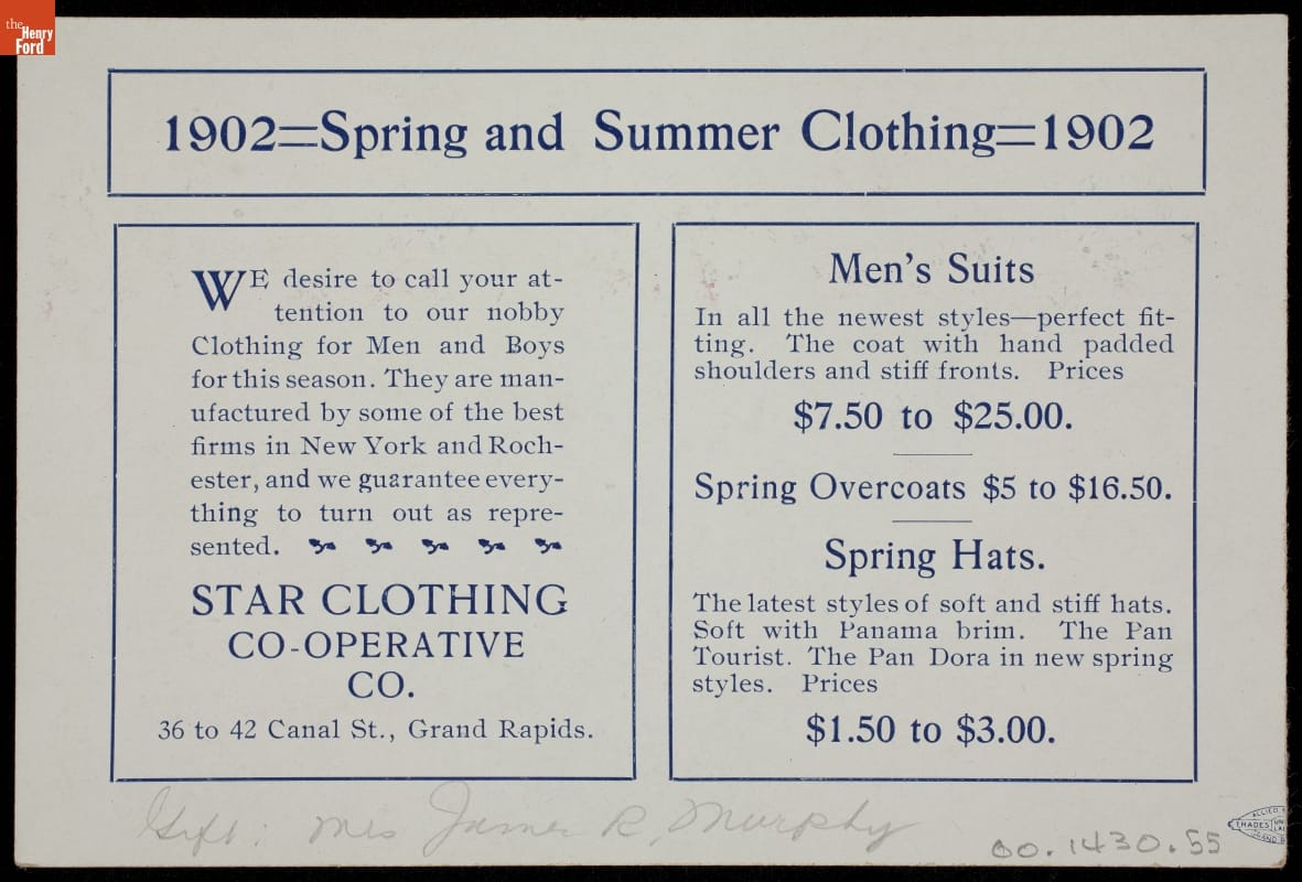 Trade Card for Spring and Summer Clothing, Star Clothing Cooperative Co., 1902