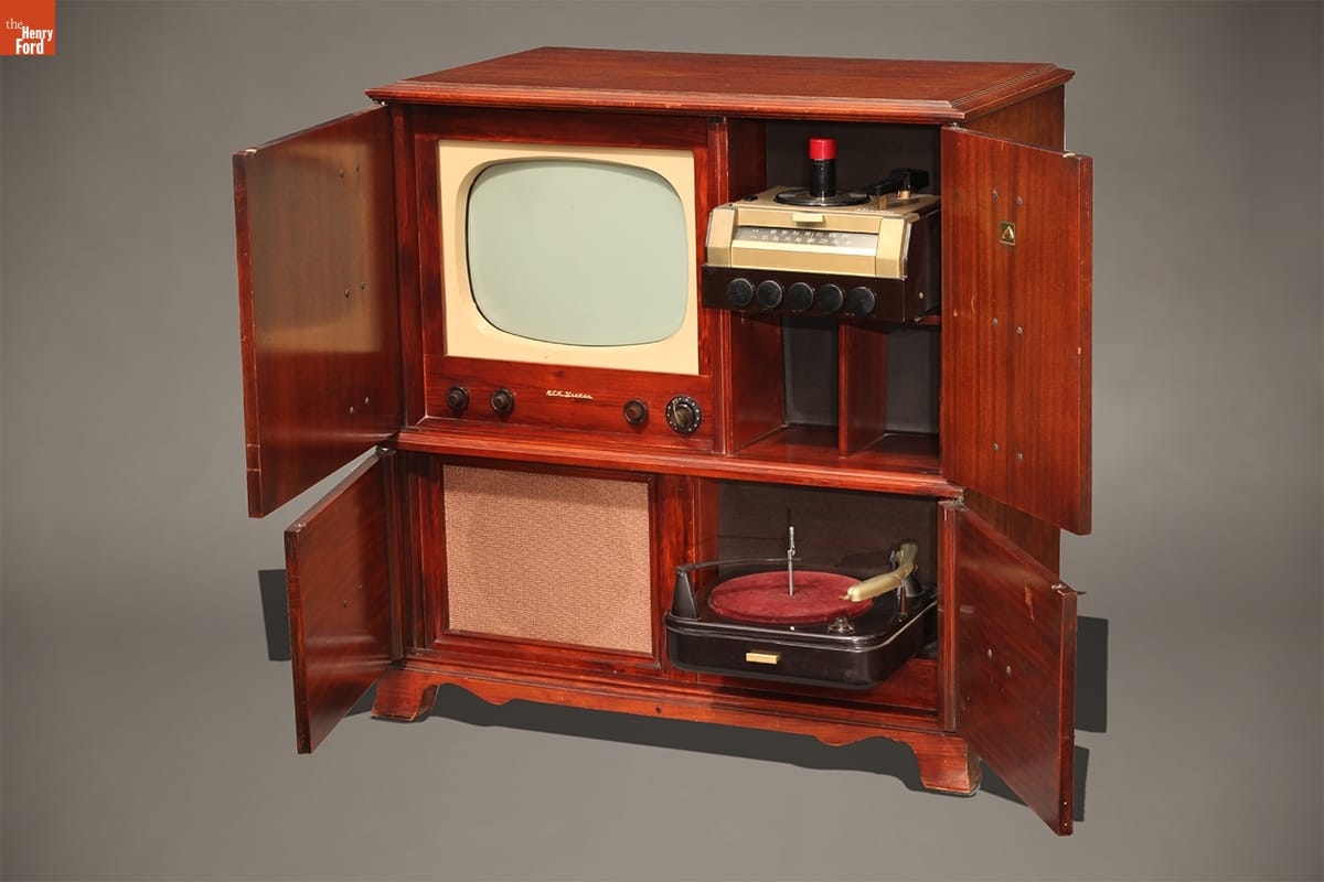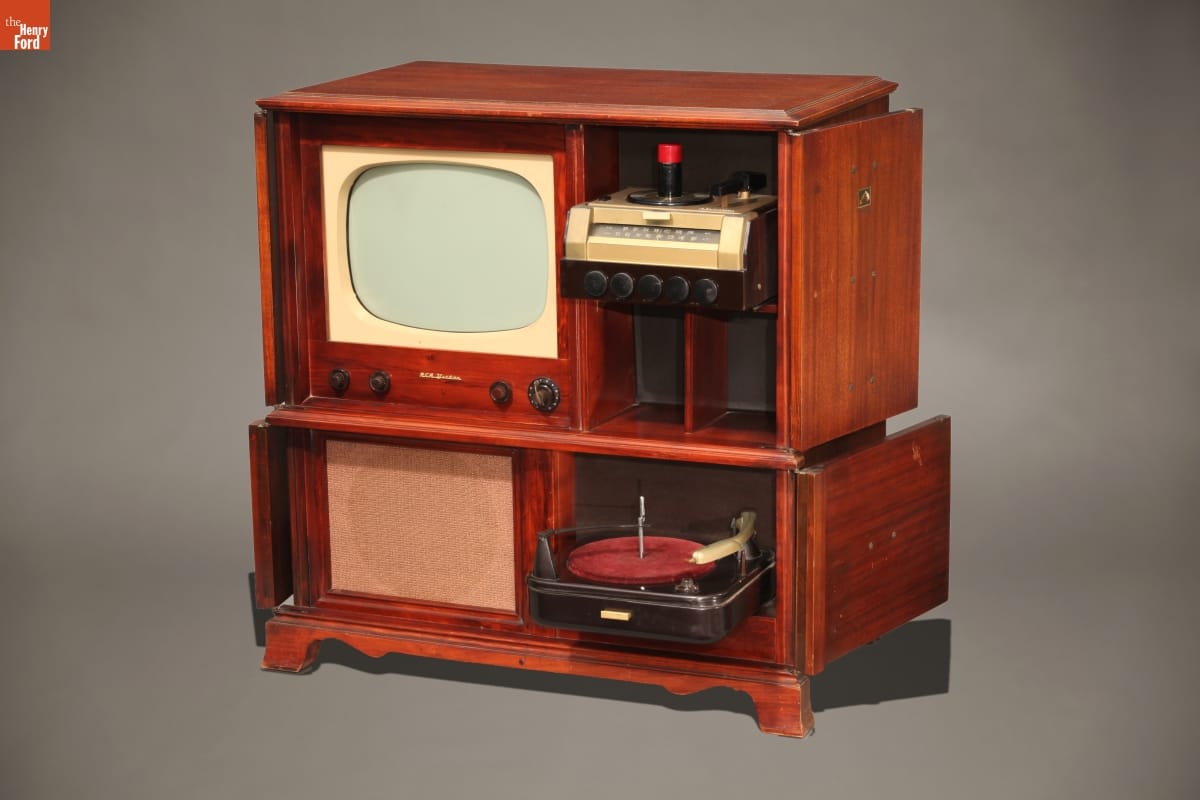 By 1950, television had joined more established modes of entertainment to become a literal fixture in America's living rooms. This RCA console is both furniture and high-tech entertainment system. An expensive, heavy, showcase piece, it includes a television, radio, and two types of phonograph, the up-to-date 45 rpm as well as the standard 78 rpm.