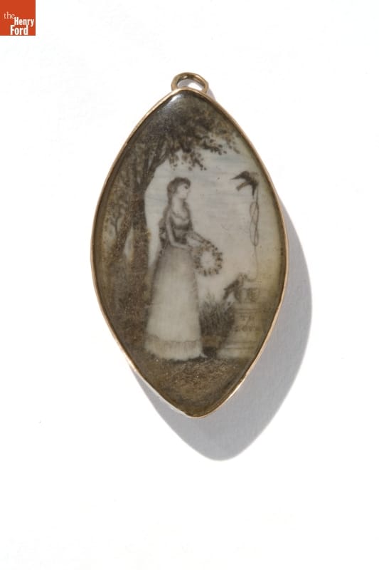 Before the 20th century, death came early and often. One way people coped was to wear jewelry as memorials to their loved ones. Over the centuries, mourning jewelry followed the prevailing fashions. Shortly after independence, Americans favored illuminated, miniature brooches and pendants painted on ivory. These featured shapes derived from classical design, symbols such as urns and weeping women dressed as ancient Romans.
