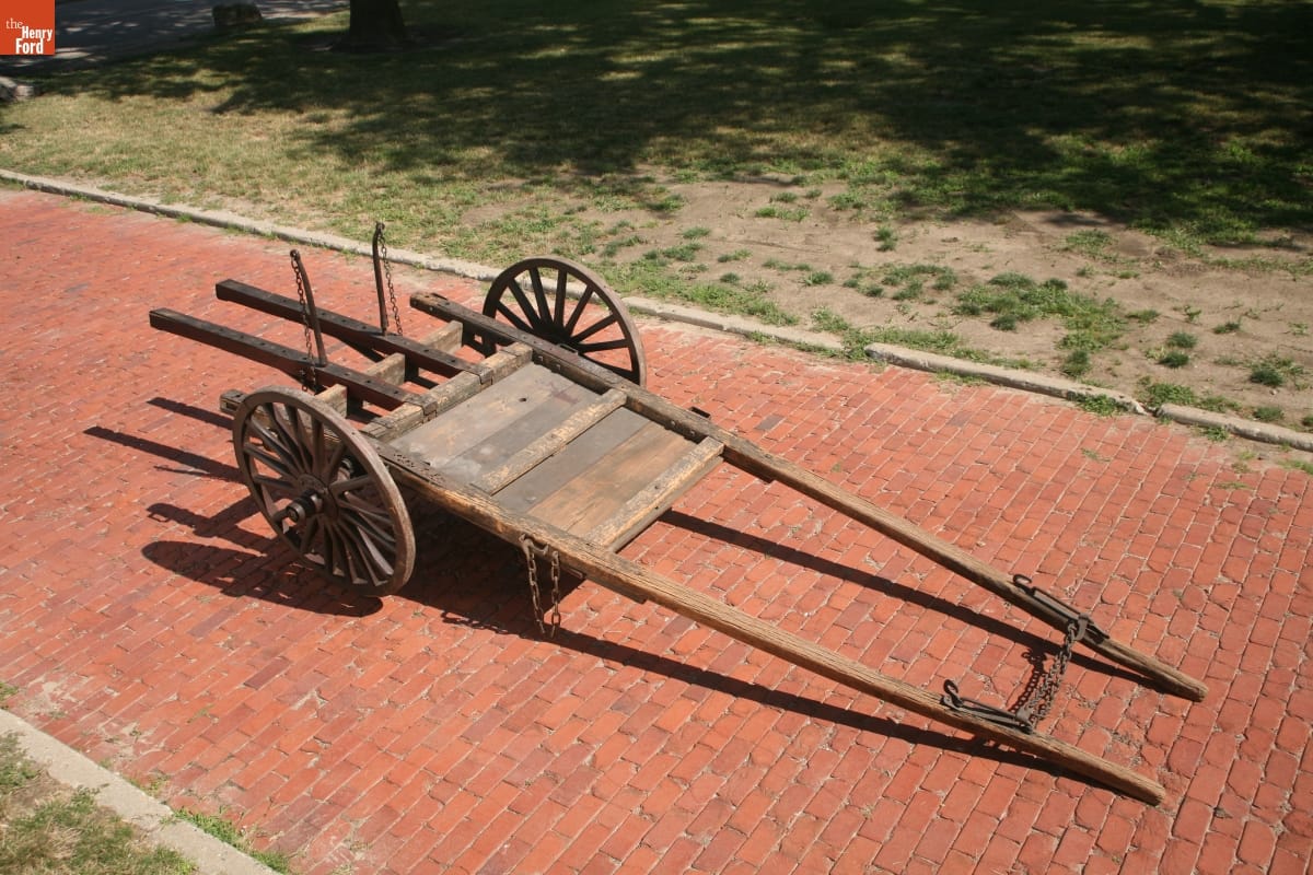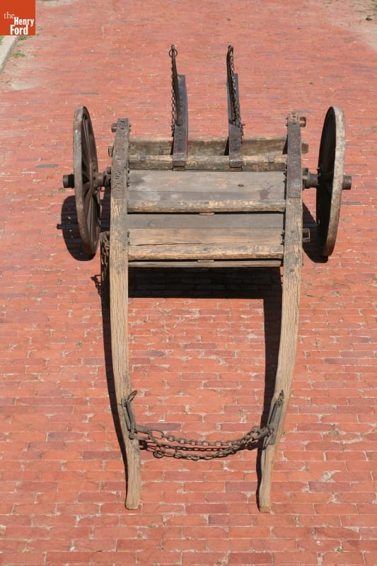 Simple two-wheeled drays like this were the most common means of moving goods between docks, railroad stations, and businesses in pre-automotive American cities. This dray was made by Studebaker of South Bend, Indiana, once the nation's largest maker of horse-drawn vehicles. Studebaker entered the automobile business in 1902 and became a major builder before ending motor vehicle production in 1966.