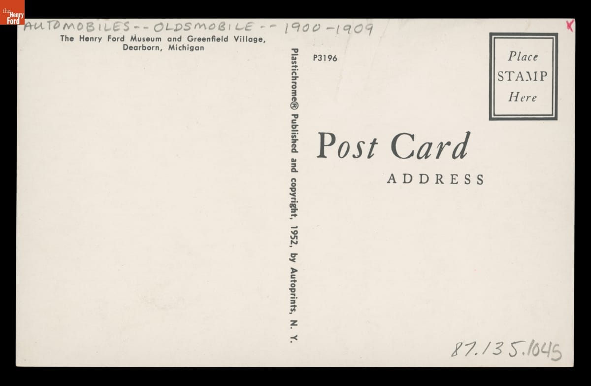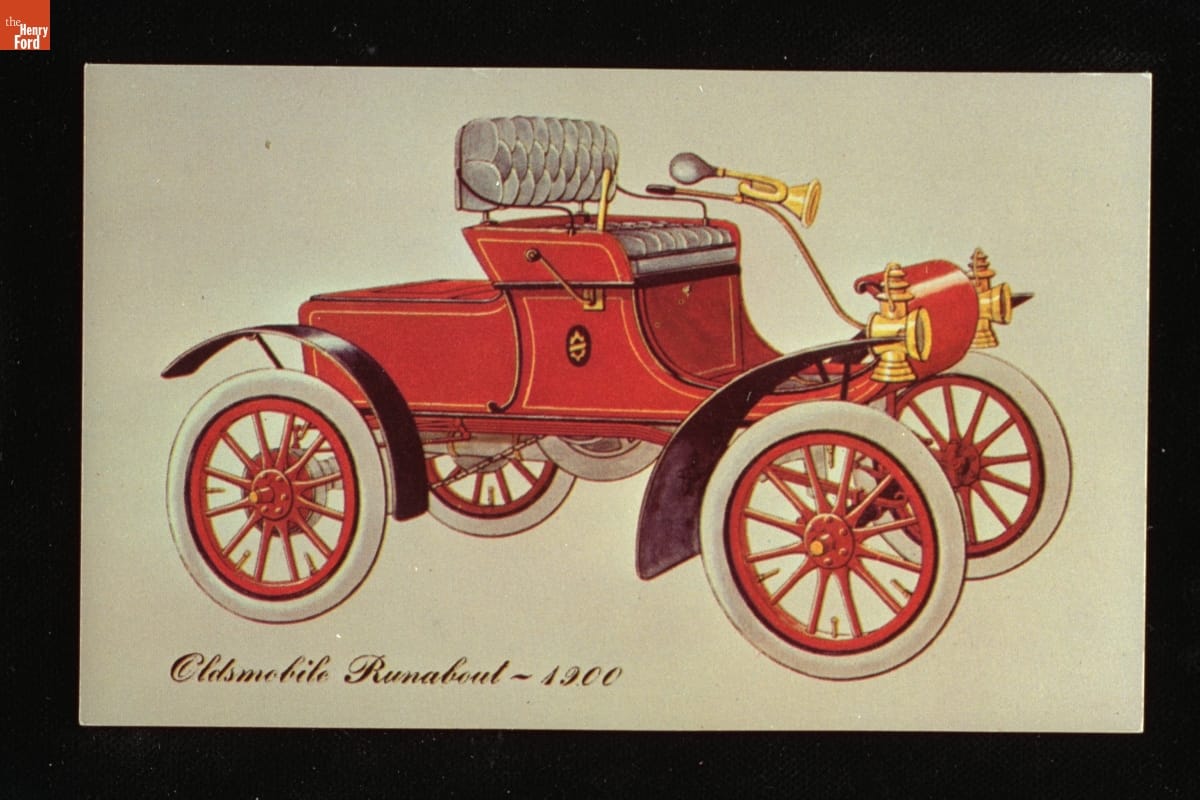 This postcard, featuring an illustration of a 1900 Oldsmobile runabout, was published by the Autoprints company of New York. Postcards like this were sold to visitors at Henry Ford Museum & Greenfield Village in the 1950s. Ransom Olds established Olds Motor Works in 1897. The company's little Curved Dash Oldsmobile pioneered the concept of an inexpensive mass-produced car.
